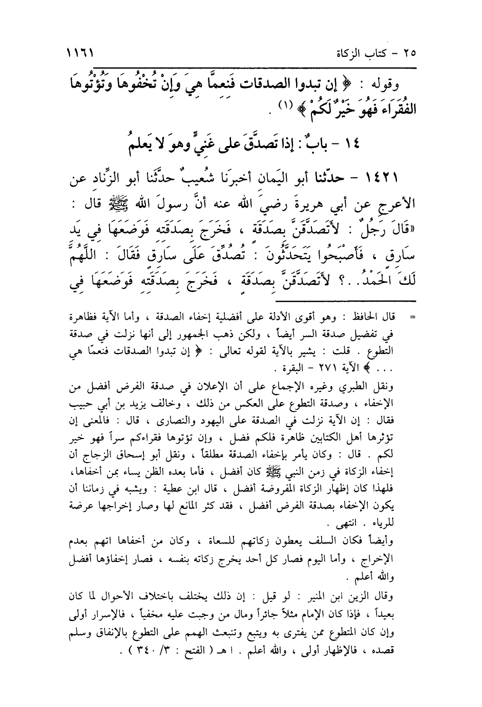 وَقَوْلِهِ: {إِنْ تُبْدُوا الصَّدَقَاتِ فَنِعِمَّا هِيَ، وَإِنْ تُخْفُوهَا وَتُؤْتُوهَا الفُقَرَاءَ فَهُوَ خَيْرٌ لَكُمْ} [البقرة: 271] الآيَةَ.
