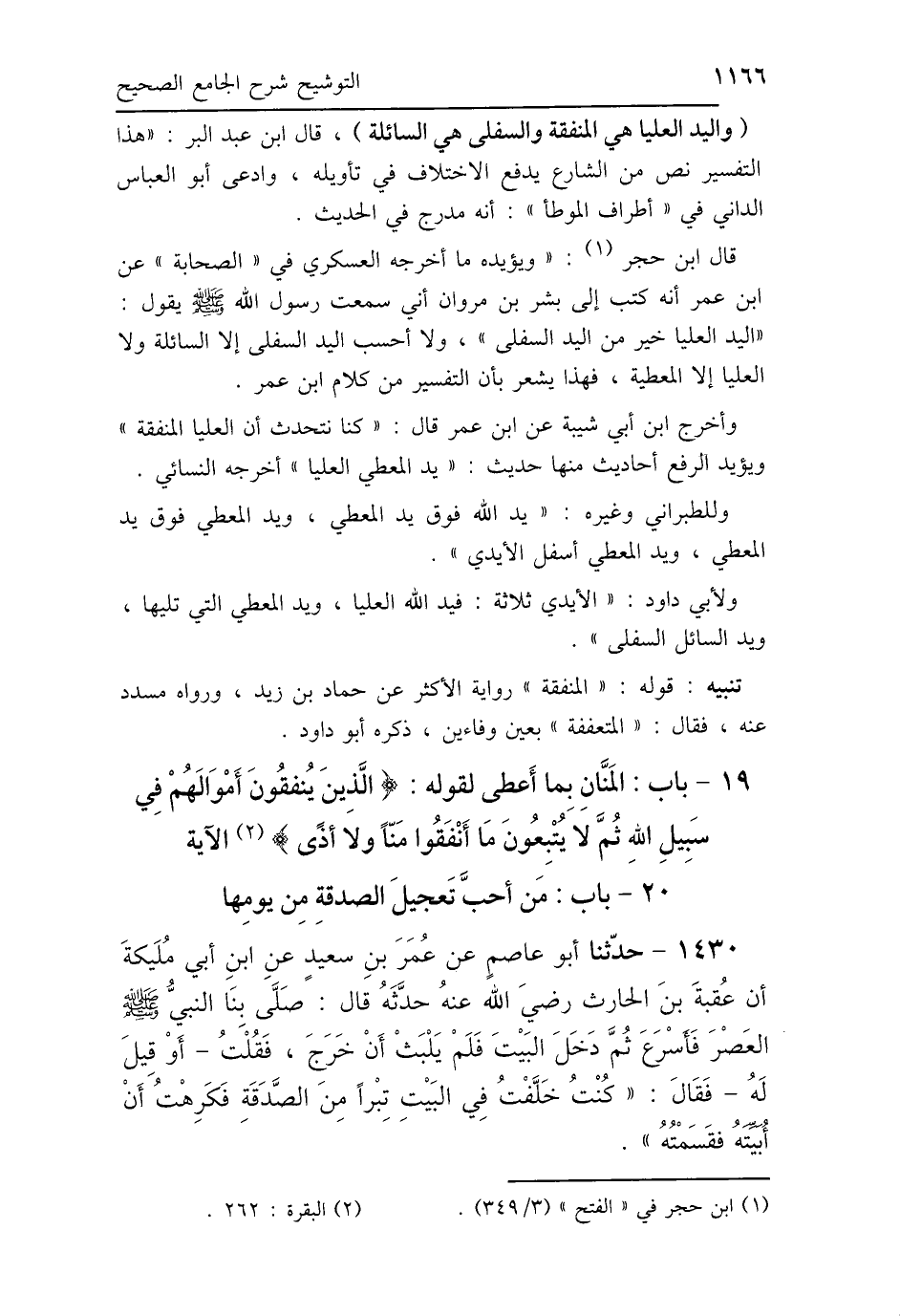 (اليد العليا هي المنفقة والسفلى هي السائلة)، قال ابن عبد البر: "هذا التفسير نص من الشارع يدفع الاختلاف في تأويله، وادعى أبو العباس الداني في "أطراف الموطأ": أنه مدرج في الحديث.