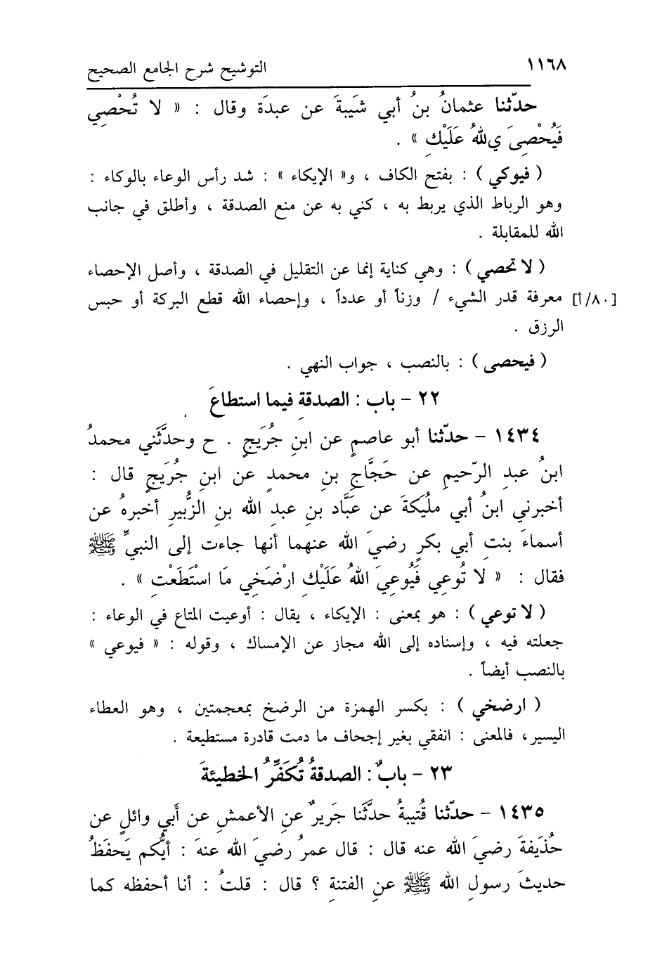 (فيوكي): بفتح الكاف، و"الإيكاء": شد رأس الوعاء بالوكاء: وهو الرباط الذي يربط به، كني به عن منع الصدقة، وأطلق في جانب الله للمقابلة.