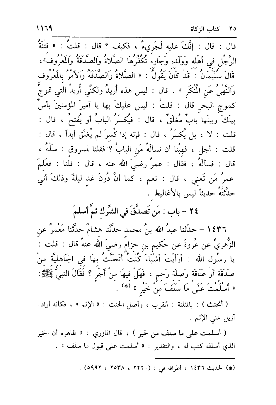 1436 - حَدَّثَنَا عَبْدُ اللَّهِ بْنُ مُحَمَّدٍ، حَدَّثَنَا هِشَامٌ، حَدَّثَنَا مَعْمَرٌ، عَنِ الزُّهْرِيِّ، عَنْ عُرْوَةَ، عَنْ حَكِيمِ بْنِ حِزَامٍ رَضِيَ اللَّهُ عَنْهُ، قَالَ: قُلْتُ: يَا رَسُولَ اللَّهِ، أَرَأَيْتَ أَشْيَاءَ كُنْتُ أَتَحَنَّثُ بِهَا فِي الجَاهِلِيَّةِ مِنْ صَدَقَةٍ أَوْ عَتَاقَةٍ، وَصِلَةِ رَحِمٍ، فَهَلْ فِيهَا مِنْ أَجْرٍ؟ فَقَالَ النَّبِيُّ صَلَّى اللهُ عَلَيْهِ وَسَلَّمَ: «أَسْلَمْتَ عَلَى مَا سَلَفَ مِنْ خَيْرٍ»