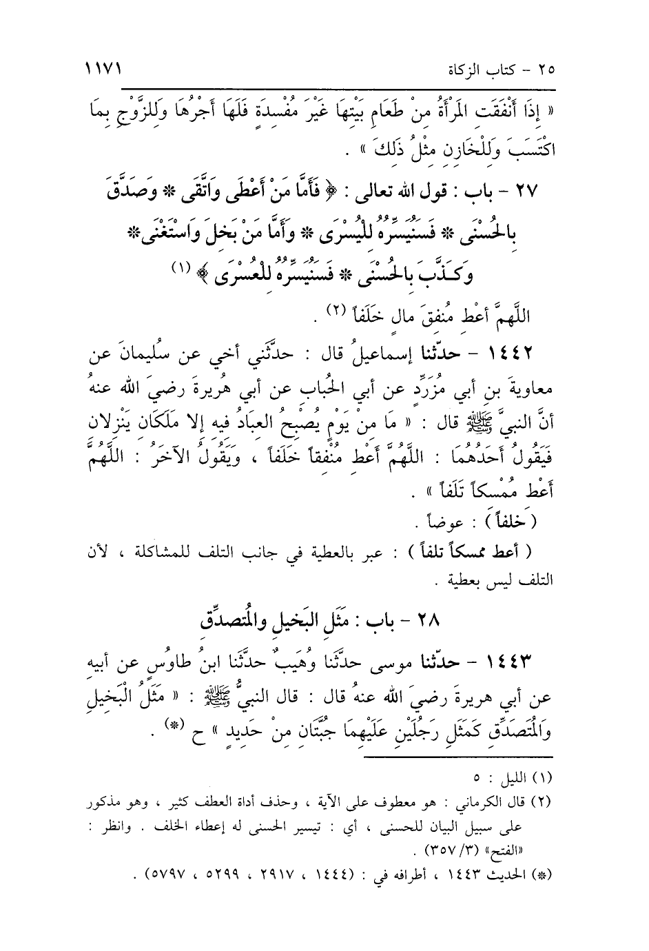 27 - بَابُ قَوْلِ اللَّهِ تَعَالَى: {فَأَمَّا مَنْ أَعْطَى وَاتَّقَى، وَصَدَّقَ بِالحُسْنَى، فَسَنُيَسِّرُهُ لِلْيُسْرَى، وَأَمَّا مَنْ بَخِلَ وَاسْتَغْنَى، وَكَذَّبَ بِالحُسْنَى، فَسَنُيَسِّرُهُ لِلْعُسْرَى} [الليل: 6] «اللَّهُمَّ أَعْطِ مُنْفِقَ مَالٍ خَلَفًا»