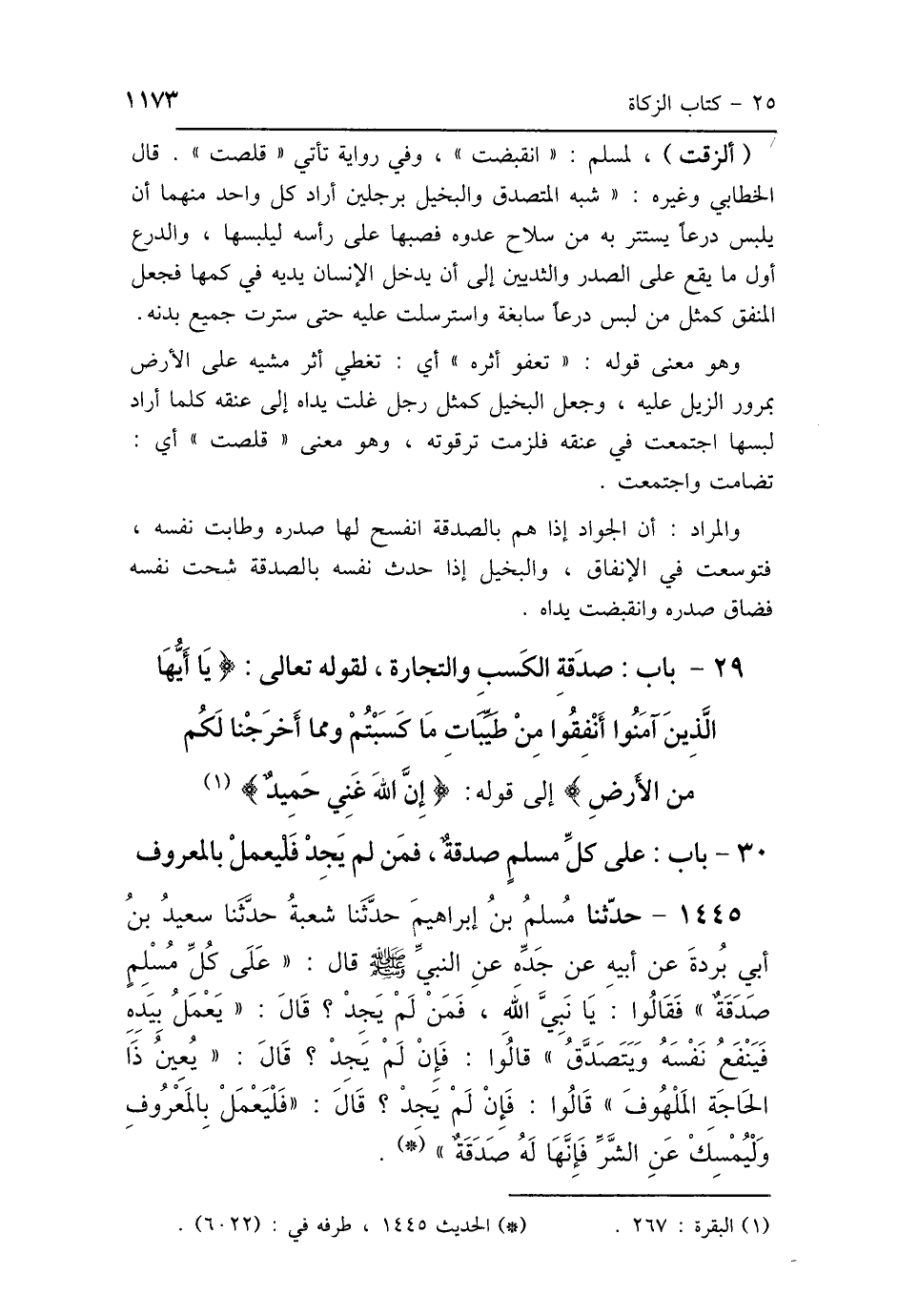 (ألزقت)، لمسلم: "انقبضت"، وفي رواية تأتي "قلصت". قال الخطابي وغيره: "شبه المتصدق والبخيل برجلين أراد كل واحد منهما أن يلبس درعا يستتر به من سلاح عدوه فصبها على رأسه ليلبسها، والدرع أول ما يقع على الصدر والثديين إلى أن يدخل الإنسان يديه في كمها فجعل المنفق كمثل من لبس درعًا سابغة واسترسلت عليه حتى سترت جميع بدنه.