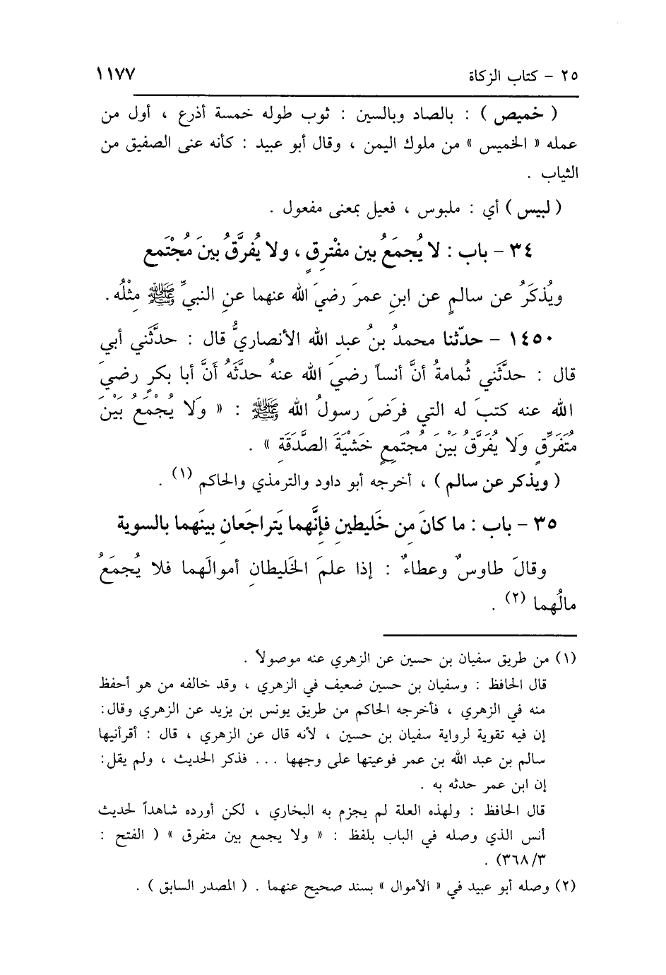 34 - بَابٌ: لاَ يُجْمَعُ بَيْنَ مُتَفَرِّقٍ، وَلاَ يُفَرَّقُ بَيْنَ مُجْتَمِعٍ
