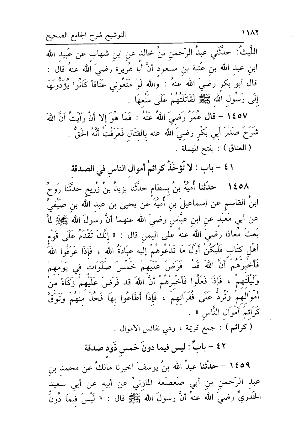 1458 - حَدَّثَنَا أُمَيَّةُ بْنُ بِسْطَامٍ، حَدَّثَنَا يَزِيدُ بْنُ زُرَيْعٍ، حَدَّثَنَا رَوْحُ بْنُ القَاسِمِ، عَنْ إِسْمَاعِيلَ بْنِ أُمَيَّةَ، عَنْ يَحْيَى بْنِ عَبْدِ اللَّهِ بْنِ صَيْفِيٍّ، عَنْ أَبِي مَعْبَدٍ، عَنِ ابْنِ عَبَّاسٍ رَضِيَ اللَّهُ عَنْهُمَا: أَنَّ رَسُولَ اللَّهِ صَلَّى اللهُ عَلَيْهِ وَسَلَّمَ لَمَّا بَعَثَ مُعَاذًا رَضِيَ اللَّهُ عَنْهُ عَلَى اليَمَنِ، قَالَ: «إِنَّكَ تَقْدَمُ عَلَى قَوْمٍ أَهْلِ كِتَابٍ، فَلْيَكُنْ أَوَّلَ مَا تَدْعُوهُمْ إِلَيْهِ عِبَادَةُ اللَّهِ، فَإِذَا عَرَفُوا اللَّهَ، فَأَخْبِرْهُمْ أَنَّ اللَّهَ قَدْ فَرَضَ عَلَيْهِمْ خَمْسَ صَلَوَاتٍ فِي يَوْمِهِمْ وَلَيْلَتِهِمْ، فَإِذَا فَعَلُوا، فَأَخْبِرْهُمْ أَنَّ اللَّهَ فَرَضَ عَلَيْهِمْ زَكَاةً مِنْ أَمْوَالِهِمْ وَتُرَدُّ عَلَى فُقَرَائِهِمْ، فَإِذَا أَطَاعُوا بِهَا، فَخُذْ مِنْهُمْ وَتَوَقَّ كَرَائِمَ أَمْوَالِ النَّاسِ».