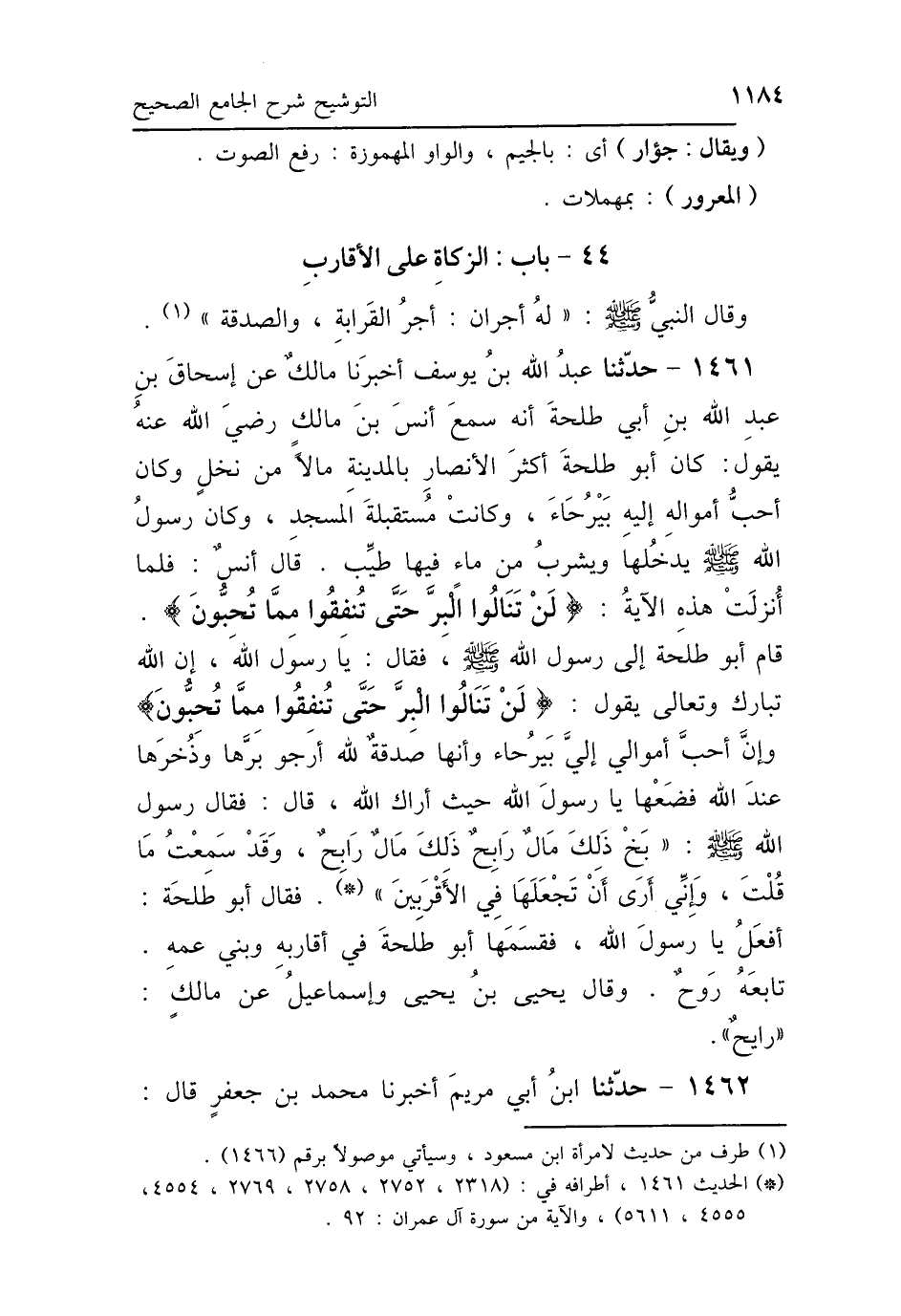 1461 - حَدَّثَنَا عَبْدُ اللَّهِ بْنُ يُوسُفَ، أَخْبَرَنَا مَالِكٌ، عَنْ إِسْحَاقَ بْنِ عَبْدِ اللَّهِ بْنِ أَبِي طَلْحَةَ، أَنَّهُ سَمِعَ أَنَسَ بْنَ مَالِكٍ رَضِيَ اللَّهُ عَنْهُ، يَقُولُ: كَانَ أَبُو طَلْحَةَ أَكْثَرَ الأَنْصَارِ بِالْمَدِينَةِ مَالًا مِنْ نَخْلٍ، وَكَانَ أَحَبُّ أَمْوَالِهِ إِلَيْهِ بَيْرُحَاءَ، وَكَانَتْ مُسْتَقْبِلَةَ المَسْجِدِ، وَكَانَ رَسُولُ اللَّهِ صَلَّى اللهُ عَلَيْهِ وَسَلَّمَ يَدْخُلُهَا وَيَشْرَبُ مِنْ مَاءٍ فِيهَا طَيِّبٍ، قَالَ أَنَسٌ: فَلَمَّا أُنْزِلَتْ هَذِهِ الآيَةُ: {لَنْ تَنَالُوا البِرَّ حَتَّى تُنْفِقُوا مِمَّا تُحِبُّونَ} [آل عمران: 92] قَامَ أَبُو طَلْحَةَ إِلَى رَسُولِ اللَّهِ صَلَّى اللهُ عَلَيْهِ وَسَلَّمَ فَقَالَ: يَا رَسُولَ اللَّهِ، إِنَّ اللَّهَ تَبَارَكَ وَتَعَالَى يَقُولُ: {لَنْ تَنَالُوا البِرَّ حَتَّى تُنْفِقُوا مِمَّا تُحِبُّونَ} [آل عمران: 92] وَإِنَّ أَحَبَّ أَمْوَالِي إِلَيَّ بَيْرُحَاءَ، وَإِنَّهَا صَدَقَةٌ لِلَّهِ، أَرْجُو بِرَّهَا وَذُخْرَهَا عِنْدَ اللَّهِ، فَضَعْهَا يَا رَسُولَ اللَّهِ حَيْثُ أَرَاكَ اللَّهُ، قَالَ: فَقَالَ رَسُولُ اللَّهِ صَلَّى اللهُ عَلَيْهِ وَسَلَّمَ: «بَخٍ، ذَلِكَ مَالٌ رَابِحٌ، ذَلِكَ مَالٌ رَابِحٌ، وَقَدْ سَمِعْتُ مَا قُلْتَ، وَإِنِّي أَرَى أَنْ تَجْعَلَهَا فِي الأَقْرَبِينَ» فَقَالَ أَبُو طَلْحَةَ: أَفْعَلُ يَا رَسُولَ اللَّهِ، فَقَسَمَهَا أَبُو طَلْحَةَ فِي أَقَارِبِهِ وَبَنِي عَمِّهِ، تَابَعَهُ رَوْحٌ، وَقَالَ يَحْيَى بْنُ يَحْيَى، وَإِسْمَاعِيلُ: عَنْ مَالِكٍ «رَايِحٌ».