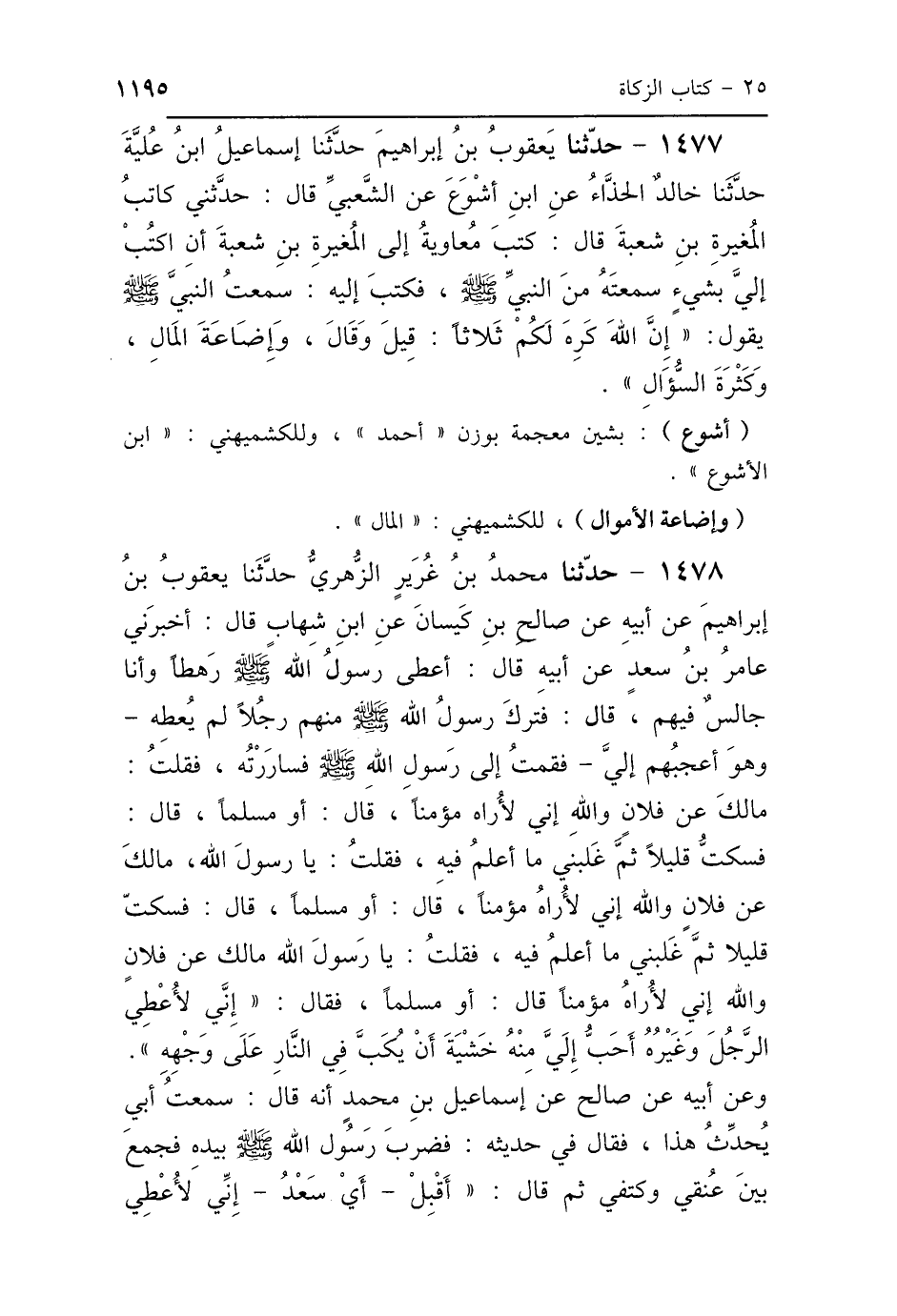 1478 - حَدَّثَنَا مُحَمَّدُ بْنُ غُرَيْرٍ الزُّهْرِيُّ، حَدَّثَنَا يَعْقُوبُ بْنُ إِبْرَاهِيمَ، عَنْ أَبِيهِ، عَنْ صَالِحِ بْنِ كَيْسَانَ، عَنِ ابْنِ شِهَابٍ، قَالَ: أَخْبَرَنِي عَامِرُ بْنُ سَعْدٍ، عَنْ أَبِيهِ، قَالَ: أَعْطَى رَسُولُ اللَّهِ صَلَّى اللهُ عَلَيْهِ وَسَلَّمَ رَهْطًا وَأَنَا جَالِسٌ فِيهِمْ، قَالَ: فَتَرَكَ رَسُولُ اللَّهِ صَلَّى اللهُ عَلَيْهِ وَسَلَّمَ مِنْهُمْ رَجُلًا لَمْ يُعْطِهِ وَهُوَ أَعْجَبُهُمْ إِلَيَّ، فَقُمْتُ إِلَى رَسُولِ اللَّهِ صَلَّى اللهُ عَلَيْهِ وَسَلَّمَ فَسَارَرْتُهُ، فَقُلْتُ: مَا لَكَ عَنْ فُلاَنٍ، وَاللَّهِ إِنِّي لَأَرَاهُ مُؤْمِنًا؟ قَالَ: «أَوْ مُسْلِمًا» قَالَ: فَسَكَتُّ قَلِيلًا، ثُمَّ غَلَبَنِي مَا أَعْلَمُ فِيهِ، فَقُلْتُ: يَا رَسُولَ اللَّهِ، مَا لَكَ عَنْ فُلاَنٍ، وَاللَّهِ إِنِّي لَأَرَاهُ مُؤْمِنًا؟ قَالَ: «أَوْ مُسْلِمًا». قَالَ: فَسَكَتُّ قَلِيلًا، ثُمَّ غَلَبَنِي مَا أَعْلَمُ فِيهِ، فَقُلْتُ: يَا رَسُولَ اللَّهِ، مَا لَكَ عَنْ فُلاَنٍ، وَاللَّهِ إِنِّي لَأَرَاهُ مُؤْمِنًا، قَالَ: «أَوْ مُسْلِمًا» يَعْنِي: فَقَالَ: «إِنِّي لَأُعْطِي الرَّجُلَ، وَغَيْرُهُ أَحَبُّ إِلَيَّ مِنْهُ، خَشْيَةَ أَنْ يُكَبَّ فِي النَّارِ عَلَى وَجْهِهِ» وَعَنْ أَبِيهِ، عَنْ صَالِحٍ، عَنْ إِسْمَاعِيلَ بْنِ مُحَمَّدٍ، أَنَّهُ قَالَ: سَمِعْتُ أَبِي يُحَدِّثُ بِهَذَا، فَقَالَ: فِي حَدِيثِهِ، فَضَرَبَ رَسُولُ اللَّهِ صَلَّى اللهُ عَلَيْهِ وَسَلَّمَ بِيَدِهِ، فَجَمَعَ بَيْنَ عُنُقِي وَكَتِفِي، ثُمَّ قَالَ: «أَقْبِلْ أَيْ سَعْدُ إِنِّي لَأُعْطِي