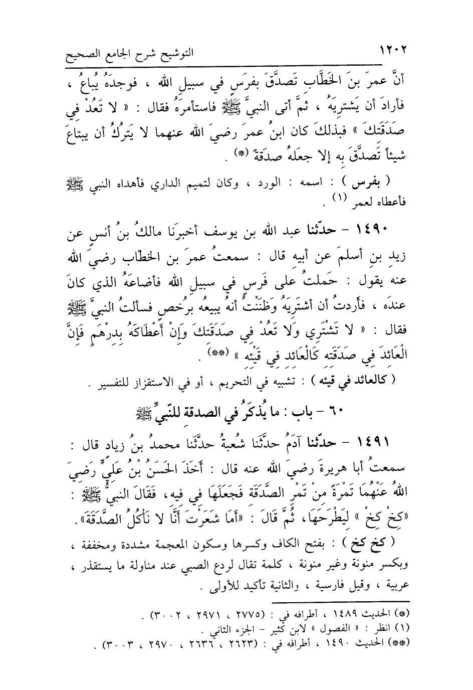 1490 - حَدَّثَنَا عَبْدُ اللَّهِ بْنُ يُوسُفَ، أَخْبَرَنَا مَالِكُ بْنُ أَنَسٍ، عَنْ زَيْدِ بْنِ أَسْلَمَ، عَنْ أَبِيهِ، قَالَ: سَمِعْتُ عُمَرَ رَضِيَ اللَّهُ عَنْهُ، يَقُولُ: حَمَلْتُ عَلَى فَرَسٍ فِي سَبِيلِ اللَّهِ، فَأَضَاعَهُ الَّذِي كَانَ عِنْدَهُ، فَأَرَدْتُ أَنْ أَشْتَرِيَهُ وَظَنَنْتُ أَنَّهُ يَبِيعُهُ بِرُخْصٍ، فَسَأَلْتُ النَّبِيَّ صَلَّى اللهُ عَلَيْهِ وَسَلَّمَ فَقَالَ: «لاَ تَشْتَرِي، وَلاَ تَعُدْ فِي صَدَقَتِكَ، وَإِنْ أَعْطَاكَهُ بِدِرْهَمٍ، فَإِنَّ العَائِدَ فِي صَدَقَتهِ كَالعَائِدِ فِي قَيْئِهِ».