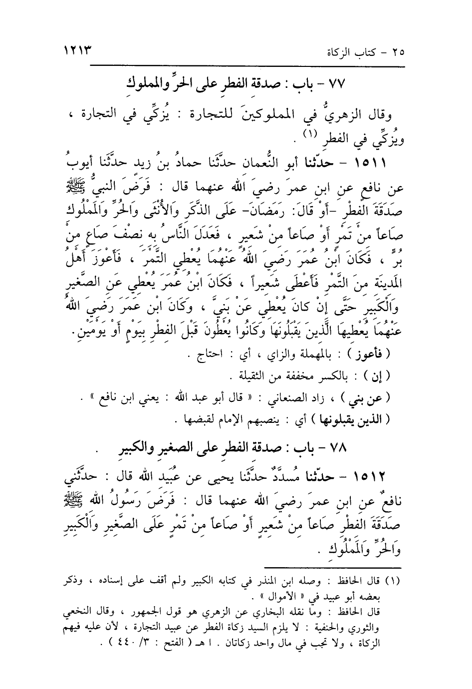1511 - حَدَّثَنَا أَبُو النُّعْمَانِ، حَدَّثَنَا حَمَّادُ بْنُ زَيْدٍ، حَدَّثَنَا أَيُّوبُ، عَنْ نَافِعٍ، عَنِ ابْنِ عُمَرَ رَضِيَ اللَّهُ عَنْهُمَا، قَالَ: " فَرَضَ النَّبِيُّ صَلَّى اللهُ عَلَيْهِ وَسَلَّمَ صَدَقَةَ الفِطْرِ - أَوْ قَالَ: رَمَضَانَ - عَلَى الذَّكَرِ، وَالأُنْثَى، وَالحُرِّ، وَالمَمْلُوكِ صَاعًا مِنْ تَمْرٍ، أَوْ صَاعًا مِنْ شَعِيرٍ «فَعَدَلَ النَّاسُ بِهِ نِصْفَ صَاعٍ مِنْ بُرٍّ، فَكَانَ ابْنُ عُمَرَ رَضِيَ اللَّهُ عَنْهُمَا،» يُعْطِي التَّمْرَ «، فَأَعْوَزَ أَهْلُ المَدِينَةِ مِنَ التَّمْرِ، فَأَعْطَى شَعِيرًا»، فَكَانَ ابْنُ عُمَرَ «يُعْطِي عَنِ الصَّغِيرِ، وَالكَبِيرِ، حَتَّى إِنْ كَانَ لِيُعْطِي عَنْ بَنِيَّ»، وَكَانَ ابْنُ عُمَرَ رَضِيَ اللَّهُ عَنْهُمَا «يُعْطِيهَا الَّذِينَ يَقْبَلُونَهَا، وَكَانُوا يُعْطُونَ قَبْلَ الفِطْرِ بِيَوْمٍ أَوْ يَوْمَيْنِ».