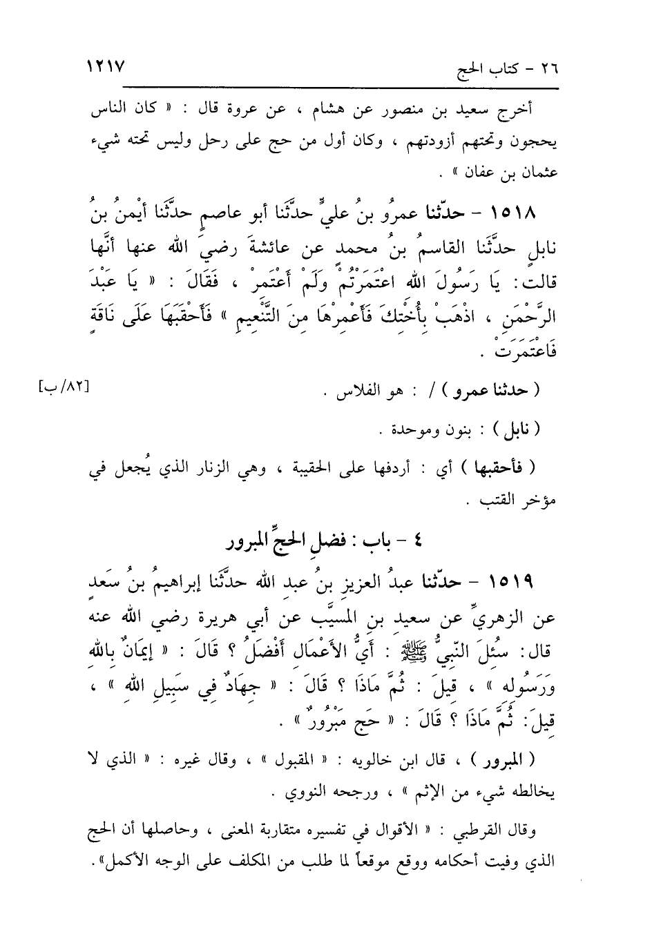 1519 - حَدَّثَنَا عَبْدُ العَزِيزِ بْنُ عَبْدِ اللَّهِ، حَدَّثَنَا إِبْرَاهِيمُ بْنُ سَعْدٍ، عَنِ الزُّهْرِيِّ، عَنْ سَعِيدِ بْنِ المُسَيِّبِ، عَنْ أَبِي هُرَيْرَةَ رَضِيَ اللَّهُ عَنْهُ، قَالَ: سُئِلَ النَّبِيُّ صَلَّى اللهُ عَلَيْهِ وَسَلَّمَ أَيُّ الأَعْمَالِ أَفْضَلُ؟ قَالَ: «إِيمَانٌ بِاللَّهِ وَرَسُولِهِ» قِيلَ: ثُمَّ مَاذَا؟ قَالَ: «جِهَادٌ فِي سَبِيلِ اللَّهِ» قِيلَ: ثُمَّ مَاذَا؟ قَالَ: «حَجٌّ مَبْرُورٌ».