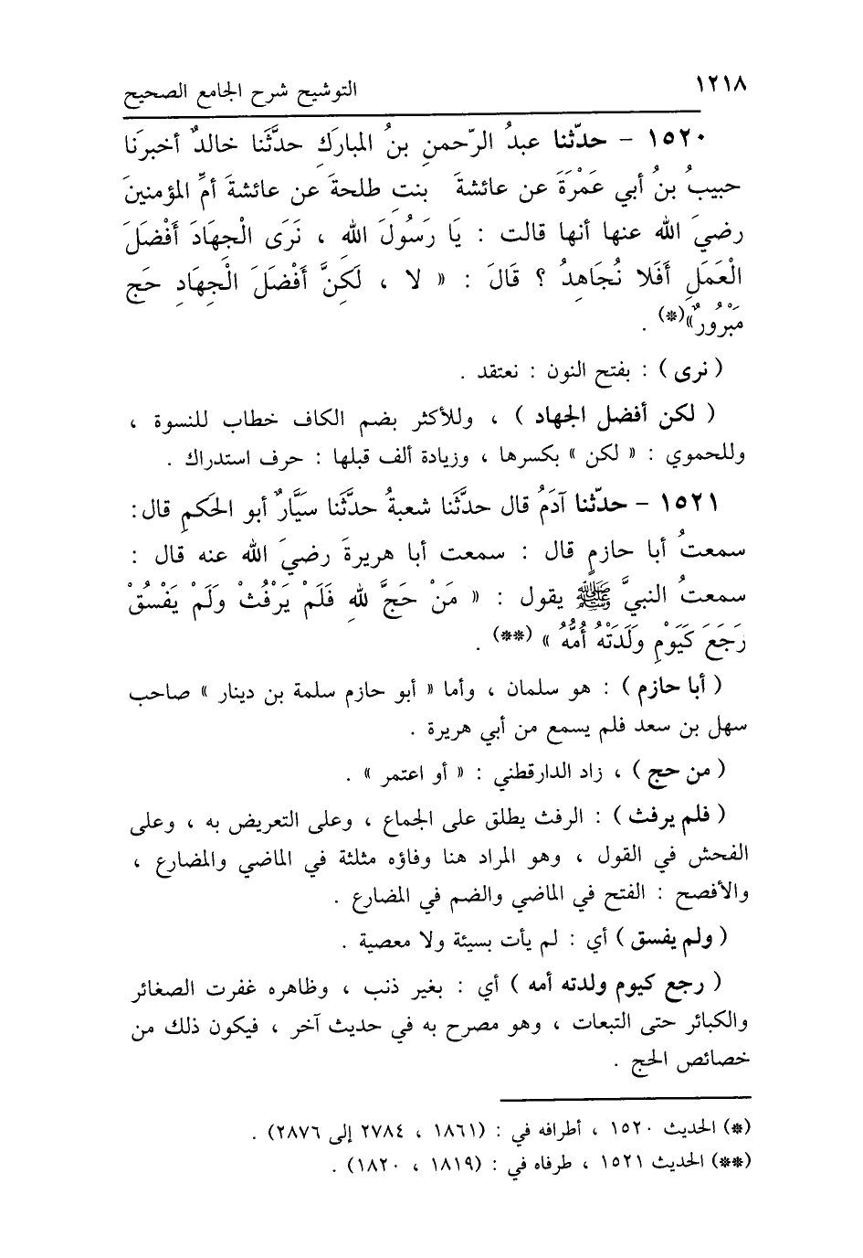 1521 - حَدَّثَنَا آدَمُ، حَدَّثَنَا شُعْبَةُ، حَدَّثَنَا سَيَّارٌ أَبُو الحَكَمِ، قَالَ: سَمِعْتُ أَبَا حَازِمٍ، قَالَ: سَمِعْتُ أَبَا هُرَيْرَةَ رَضِيَ اللَّهُ عَنْهُ، قَالَ: سَمِعْتُ النَّبِيَّ صَلَّى اللهُ عَلَيْهِ وَسَلَّمَ يَقُولُ: «مَنْ حَجَّ لِلَّهِ فَلَمْ يَرْفُثْ، وَلَمْ يَفْسُقْ، رَجَعَ كَيَوْمِ وَلَدَتْهُ أُمُّهُ».