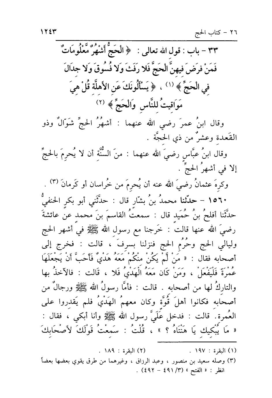 33 - بَابُ قَوْلِ اللَّهِ تَعَالَى: {الحَجُّ أَشْهُرٌ مَعْلُومَاتٌ، فَمَنْ فَرَضَ فِيهِنَّ الحَجَّ فَلاَ رَفَثَ، وَلاَ فُسُوقَ وَلاَ جِدَالَ فِي الحَجِّ} [البقرة: 197] وَقَوْلِهِ {يَسْأَلُونَكَ عَنِ الأَهِلَّةِ، قُلْ: هِيَ مَوَاقِيتُ لِلنَّاسِ وَالحَجِّ} [البقرة: 189]