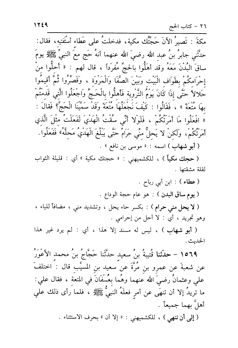 مَكَّةَ: تَصِيرُ الآنَ حَجَّتُكَ مَكِّيَّةً، فَدَخَلْتُ عَلَى عَطَاءٍ أَسْتَفْتِيهِ، فَقَالَ: حَدَّثَنِي جَابِرُ بْنُ عَبْدِ اللَّهِ رَضِيَ اللَّهُ عَنْهُمَا: أَنَّهُ حَجَّ مَعَ النَّبِيِّ صَلَّى اللهُ عَلَيْهِ وَسَلَّمَ يَوْمَ سَاقَ البُدْنَ مَعَهُ، وَقَدْ أَهَلُّوا بِالحَجِّ مُفْرَدًا، فَقَالَ لَهُمْ: «أَحِلُّوا مِنْ إِحْرَامِكُمْ بِطَوَافِ البَيْتِ، وَبَيْنَ الصَّفَا وَالمَرْوَةِ، وَقَصِّرُوا، ثُمَّ أَقِيمُوا حَلاَلًا، حَتَّى إِذَا كَانَ يَوْمُ التَّرْوِيَةِ فَأَهِلُّوا بِالحَجِّ، وَاجْعَلُوا الَّتِي قَدِمْتُمْ بِهَا مُتْعَةً»، فَقَالُوا: كَيْفَ نَجْعَلُهَا مُتْعَةً، وَقَدْ سَمَّيْنَا الحَجَّ؟ فَقَالَ: «افْعَلُوا مَا أَمَرْتُكُمْ، فَلَوْلاَ أَنِّي سُقْتُ الهَدْيَ لَفَعَلْتُ مِثْلَ الَّذِي أَمَرْتُكُمْ، وَلَكِنْ لاَ يَحِلُّ مِنِّي حَرَامٌ حَتَّى يَبْلُغَ الهَدْيُ مَحِلَّهُ» فَفَعَلُوا قَالَ أَبُو عَبْدِ اللَّهِ: «أَبُو شِهَابٍ لَيْسَ لَهُ مُسْنَدٌ إِلَّا هَذَا».