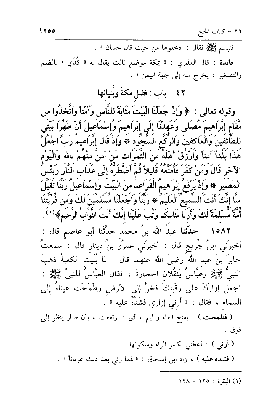 1582 - حَدَّثَنَا عَبْدُ اللَّهِ بْنُ مُحَمَّدٍ، حَدَّثَنَا أَبُو عَاصِمٍ، قَالَ: أَخْبَرَنِي ابْنُ جُرَيْجٍ، قَالَ: أَخْبَرَنِي عَمْرُو بْنُ دِينَارٍ، قَالَ: سَمِعْتُ جَابِرَ بْنَ عَبْدِ اللَّهِ رَضِيَ اللَّهُ عَنْهُمَا، قَالَ: لَمَّا بُنِيَتِ الكَعْبَةُ ذَهَبَ النَّبِيُّ صَلَّى اللهُ عَلَيْهِ وَسَلَّمَ وَعَبَّاسٌ يَنْقُلاَنِ الحِجَارَةَ، فَقَالَ العَبَّاسُ لِلنَّبِيِّ صَلَّى اللهُ عَلَيْهِ وَسَلَّمَ: اجْعَلْ إِزَارَكَ عَلَى رَقَبَتِكَ، فَخَرَّ إِلَى الأَرْضِ، وَطَمَحَتْ عَيْنَاهُ إِلَى السَّمَاءِ، فَقَالَ: «أَرِنِي إِزَارِي» فَشَدَّهُ عَلَيْهِ.