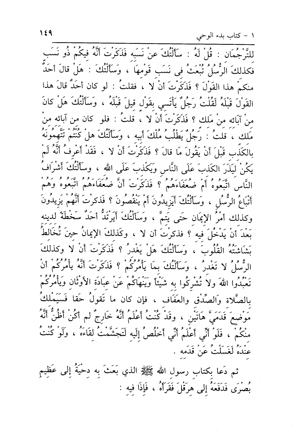 لِلتَّرْجُمَانِ: قُلْ لَهُ: سَأَلْتُكَ عَنْ نَسَبِهِ فَذَكَرْتَ أَنَّهُ فِيكُمْ ذُو نَسَبٍ، فَكَذَلِكَ الرُّسُلُ تُبْعَثُ فِي نَسَبِ قَوْمِهَا. وَسَأَلْتُكَ هَلْ قَالَ أَحَدٌ مِنْكُمْ هَذَا القَوْلَ، فَذَكَرْتَ أَنْ لاَ، فَقُلْتُ: لَوْ كَانَ أَحَدٌ قَالَ هَذَا القَوْلَ قَبْلَهُ، لَقُلْتُ رَجُلٌ يَأْتَسِي بِقَوْلٍ قِيلَ قَبْلَهُ. وَسَأَلْتُكَ هَلْ كَانَ مِنْ آبَائِهِ مِنْ مَلِكٍ، فَذَكَرْتَ أَنْ لاَ، قُلْتُ فَلَوْ كَانَ مِنْ آبَائِهِ مِنْ مَلِكٍ، قُلْتُ رَجُلٌ يَطْلُبُ مُلْكَ أَبِيهِ، وَسَأَلْتُكَ، هَلْ كُنْتُمْ تَتَّهِمُونَهُ بِالكَذِبِ قَبْلَ أَنْ يَقُولَ مَا قَالَ، فَذَكَرْتَ أَنْ لاَ، فَقَدْ أَعْرِفُ أَنَّهُ لَمْ يَكُنْ لِيَذَرَ الكَذِبَ عَلَى النَّاسِ وَيَكْذِبَ عَلَى اللَّهِ. وَسَأَلْتُكَ أَشْرَافُ النَّاسِ اتَّبَعُوهُ أَمْ ضُعَفَاؤُهُمْ، فَذَكَرْتَ أَنَّ ضُعَفَاءَهُمُ اتَّبَعُوهُ، وَهُمْ أَتْبَاعُ الرُّسُلِ. وَسَأَلْتُكَ أَيَزِيدُونَ أَمْ يَنْقُصُونَ، فَذَكَرْتَ أَنَّهُمْ يَزِيدُونَ، وَكَذَلِكَ أَمْرُ الإِيمَانِ حَتَّى يَتِمَّ. وَسَأَلْتُكَ أَيَرْتَدُّ أَحَدٌ سَخْطَةً لِدِينِهِ بَعْدَ أَنْ يَدْخُلَ فِيهِ، فَذَكَرْتَ أَنْ لاَ، وَكَذَلِكَ الإِيمَانُ حِينَ تُخَالِطُ بَشَاشَتُهُ القُلُوبَ. وَسَأَلْتُكَ هَلْ يَغْدِرُ، فَذَكَرْتَ أَنْ لاَ، وَكَذَلِكَ الرُّسُلُ لاَ تَغْدِرُ. وَسَأَلْتُكَ بِمَا يَأْمُرُكُمْ، فَذَكَرْتَ أَنَّهُ يَأْمُرُكُمْ أَنْ تَعْبُدُوا اللَّهَ وَلاَ تُشْرِكُوا بِهِ شَيْئًا، وَيَنْهَاكُمْ عَنْ عِبَادَةِ الأَوْثَانِ، وَيَأْمُرُكُمْ بِالصَّلاَةِ وَالصِّدْقِ وَالعَفَافِ، فَإِنْ كَانَ مَا تَقُولُ حَقًّا فَسَيَمْلِكُ مَوْضِعَ قَدَمَيَّ هَاتَيْنِ، وَقَدْ كُنْتُ أَعْلَمُ أَنَّهُ خَارِجٌ، لَمْ أَكُنْ أَظُنُّ أَنَّهُ مِنْكُمْ، فَلَوْ أَنِّي أَعْلَمُ أَنِّي أَخْلُصُ إِلَيْهِ لَتَجَشَّمْتُ لِقَاءَهُ، وَلَوْ كُنْتُ عِنْدَهُ لَغَسَلْتُ عَنْ قَدَمِهِ. ثُمَّ دَعَا بِكِتَابِ رَسُولِ اللَّهِ صَلَّى اللهُ عَلَيْهِ وَسَلَّمَ الَّذِي بَعَثَ بِهِ دِحْيَةُ إِلَى عَظِيمِ بُصْرَى، فَدَفَعَهُ إِلَى هِرَقْلَ، فَقَرَأَهُ فَإِذَا فِيهِ: