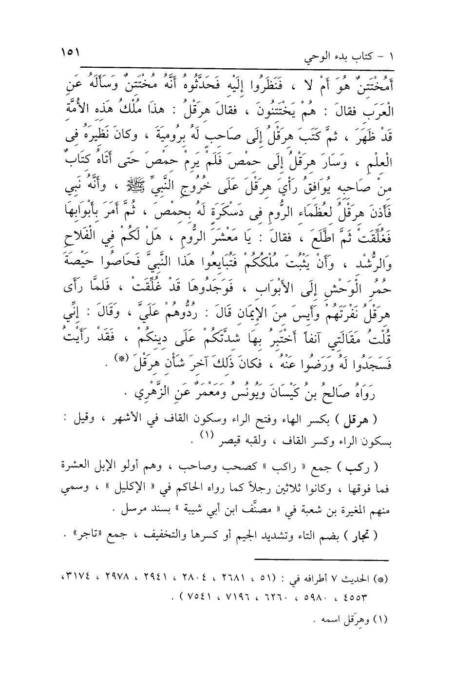 أَمُخْتَتِنٌ هُوَ أَمْ لاَ، فَنَظَرُوا إِلَيْهِ، فَحَدَّثُوهُ أَنَّهُ مُخْتَتِنٌ، وَسَأَلَهُ عَنِ العَرَبِ، فَقَالَ: هُمْ يَخْتَتِنُونَ، فَقَالَ هِرَقْلُ: هَذَا مُلْكُ هَذِهِ الأُمَّةِ قَدْ ظَهَرَ. ثُمَّ كَتَبَ هِرَقْلُ إِلَى صَاحِبٍ لَهُ بِرُومِيَةَ، وَكَانَ نَظِيرَهُ فِي العِلْمِ، وَسَارَ هِرَقْلُ إِلَى حِمْصَ، فَلَمْ يَرِمْ حِمْصَ حَتَّى أَتَاهُ كِتَابٌ مِنْ صَاحِبِهِ يُوَافِقُ رَأْيَ هِرَقْلَ عَلَى خُرُوجِ النَّبِيِّ صَلَّى اللهُ عَلَيْهِ وَسَلَّمَ، وَأَنَّهُ نَبِيٌّ، فَأَذِنَ هِرَقْلُ لِعُظَمَاءِ الرُّومِ فِي دَسْكَرَةٍ لَهُ بِحِمْصَ، ثُمَّ أَمَرَ بِأَبْوَابِهَا فَغُلِّقَتْ، ثُمَّ اطَّلَعَ فَقَالَ: يَا مَعْشَرَ الرُّومِ، هَلْ لَكُمْ فِي الفَلاَحِ وَالرُّشْدِ، وَأَنْ يَثْبُتَ مُلْكُكُمْ، فَتُبَايِعُوا هَذَا النَّبِيَّ؟ فَحَاصُوا حَيْصَةَ حُمُرِ الوَحْشِ إِلَى الأَبْوَابِ، فَوَجَدُوهَا قَدْ غُلِّقَتْ، فَلَمَّا رَأَى هِرَقْلُ نَفْرَتَهُمْ، وَأَيِسَ مِنَ الإِيمَانِ، قَالَ: رُدُّوهُمْ عَلَيَّ، وَقَالَ: إِنِّي قُلْتُ مَقَالَتِي آنِفًا أَخْتَبِرُ بِهَا شِدَّتَكُمْ عَلَى دِينِكُمْ، فَقَدْ رَأَيْتُ، فَسَجَدُوا لَهُ وَرَضُوا عَنْهُ، فَكَانَ ذَلِكَ آخِرَ شَأْنِ هِرَقْلَ رَوَاهُ صَالِحُ بْنُ كَيْسَانَ، وَيُونُسُ، وَمَعْمَرٌ، عَنِ الزُّهْرِيِّ.