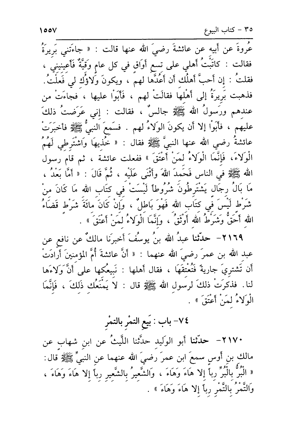 عُرْوَةَ، عَنْ أَبِيهِ، عَنْ عَائِشَةَ رَضِيَ اللَّهُ عَنْهَا، قَالَتْ: جَاءَتْنِي بَرِيرَةُ فَقَالَتْ: كَاتَبْتُ أَهْلِي عَلَى تِسْعِ أَوَاقٍ، فِي كُلِّ عَامٍ وَقِيَّةٌ، فَأَعِينِينِي، فَقُلْتُ: إِنْ أَحَبَّ أَهْلُكِ أَنْ أَعُدَّهَا لَهُمْ، وَيَكُونَ وَلاَؤُكِ لِي فَعَلْتُ، فَذَهَبَتْ بَرِيرَةُ إِلَى أَهْلِهَا، فَقَالَتْ لَهُمْ فَأَبَوْا ذَلِكَ عَلَيْهَا، فَجَاءَتْ مِنْ عِنْدِهِمْ وَرَسُولُ اللَّهِ صَلَّى اللهُ عَلَيْهِ وَسَلَّمَ جَالِسٌ، فَقَالَتْ: إِنِّي قَدْ عَرَضْتُ ذَلِكَ عَلَيْهِمْ فَأَبَوْا إِلَّا أَنْ يَكُونَ الوَلاَءُ لَهُمْ، فَسَمِعَ النَّبِيُّ صَلَّى اللهُ عَلَيْهِ وَسَلَّمَ، فَأَخْبَرَتْ عَائِشَةُ النَّبِيَّ صَلَّى اللهُ عَلَيْهِ وَسَلَّمَ، فَقَالَ: «خُذِيهَا وَاشْتَرِطِي لَهُمُ الوَلاَءَ، فَإِنَّمَا الوَلاَءُ لِمَنْ أَعْتَقَ»، فَفَعَلَتْ عَائِشَةُ، ثُمَّ قَامَ رَسُولُ اللَّهِ صَلَّى اللهُ عَلَيْهِ وَسَلَّمَ فِي النَّاسِ، فَحَمِدَ اللَّهَ وَأَثْنَى عَلَيْهِ، ثُمَّ قَالَ: «أَمَّا بَعْدُ، مَا بَالُ رِجَالٍ يَشْتَرِطُونَ شُرُوطًا لَيْسَتْ فِي كِتَابِ اللَّهِ، مَا كَانَ مِنْ شَرْطٍ لَيْسَ فِي كِتَابِ اللَّهِ فَهُوَ بَاطِلٌ، وَإِنْ كَانَ مِائَةَ شَرْطٍ، قَضَاءُ اللَّهِ أَحَقُّ، وَشَرْطُ اللَّهِ أَوْثَقُ، وَإِنَّمَا الوَلاَءُ لِمَنْ أَعْتَقَ».