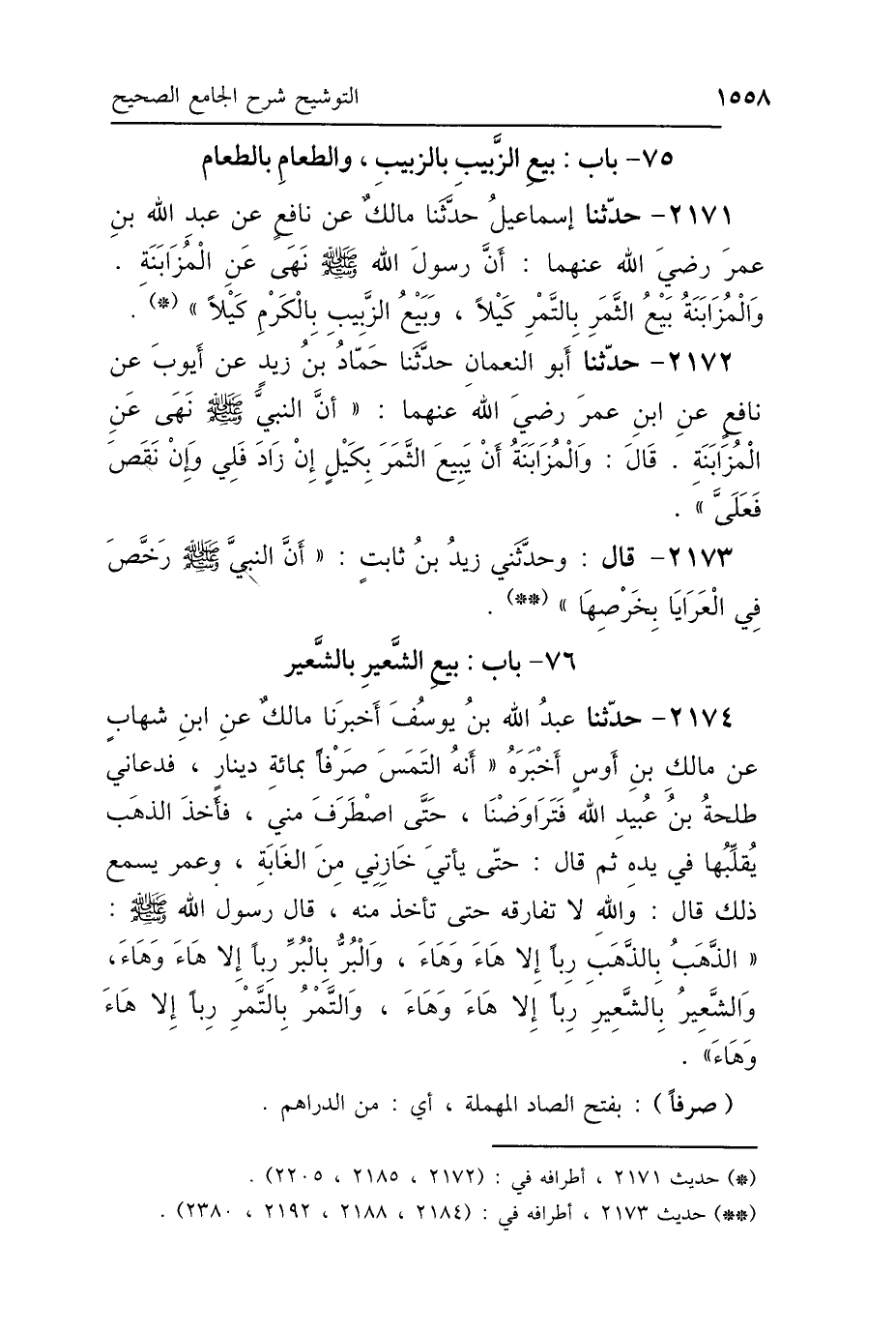 2174 - حَدَّثَنَا عَبْدُ اللَّهِ بْنُ يُوسُفَ، أَخْبَرَنَا مَالِكٌ، عَنِ ابْنِ شِهَابٍ، عَنْ مَالِكِ بْنِ أَوْسٍ، أَخْبَرَهُ: أَنَّهُ التَمَسَ صَرْفًا بِمِائَةِ دِينَارٍ، فَدَعَانِي طَلْحَةُ بْنُ عُبَيْدِ اللَّهِ، فَتَرَاوَضْنَا حَتَّى اصْطَرَفَ مِنِّي، فَأَخَذَ الذَّهَبَ يُقَلِّبُهَا فِي يَدِهِ، ثُمَّ قَالَ: حَتَّى يَأْتِيَ خَازِنِي مِنَ الغَابَةِ، وَعُمَرُ يَسْمَعُ ذَلِكَ، فَقَالَ: وَاللَّهِ لاَ تُفَارِقُهُ حَتَّى تَأْخُذَ مِنْهُ، قَالَ رَسُولُ اللَّهِ صَلَّى اللهُ عَلَيْهِ وَسَلَّمَ: «الذَّهَبُ بِالذَّهَبِ رِبًا إِلَّا هَاءَ وَهَاءَ، وَالبُرُّ بِالْبُرِّ رِبًا إِلَّا هَاءَ وَهَاءَ، وَالشَّعِيرُ بِالشَّعِيرِ رِبًا إِلَّا هَاءَ وَهَاءَ، وَالتَّمْرُ بِالتَّمْرِ رِبًا إِلَّا هَاءَ وَهَاءَ».