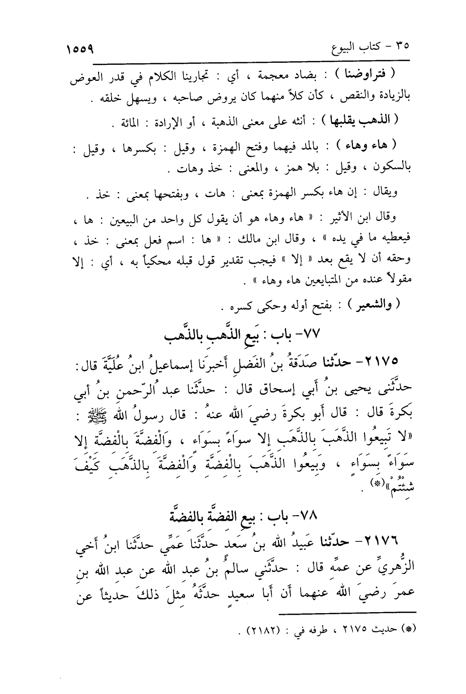 وقال ابن الأثير: "هاء وهاء هو أن يقول كل واحد من البيعين: ها، فيعطيه ما في يده"، وقال ابن مالك: "ها: اسم فعل بمعنى: خذ، وحقه أن لا يقع بعد "إلا" فيجب تقدير قول قبله محكيًّا به، أي: إلا مقولًا، عنده من المتبايعين هاء وهاء".
