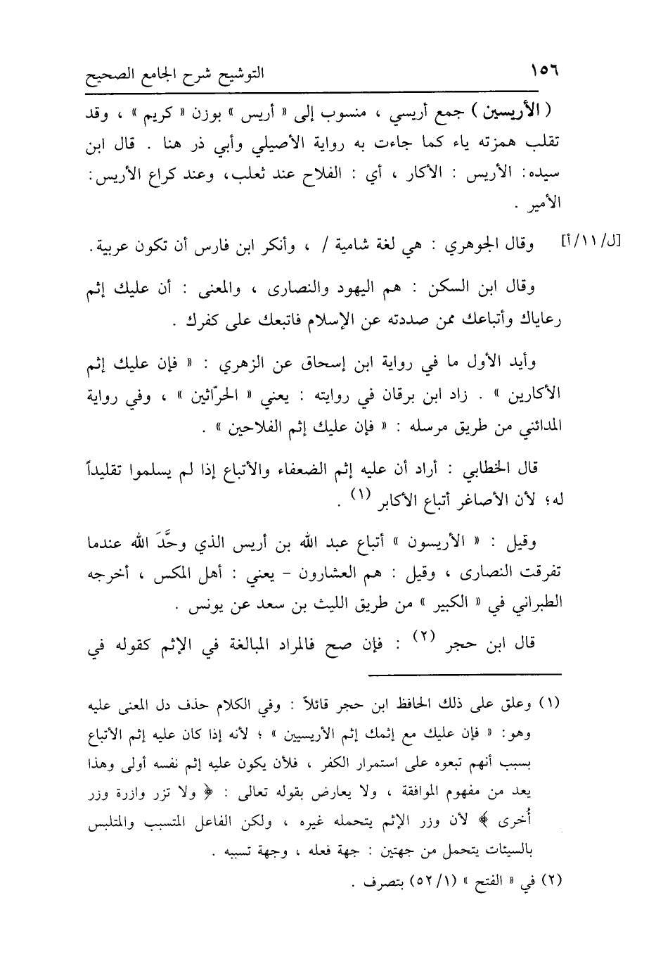 وأيد الأول ما في رواية ابن إسحاق عن الزهري: "فإن عليك إثم الأكارين". زاد ابن برقان في روايته: يعني "الحرّاثين"، وفي رواية المدائني من طريق مرسله: "فإن عليك إثم الفلاحين".