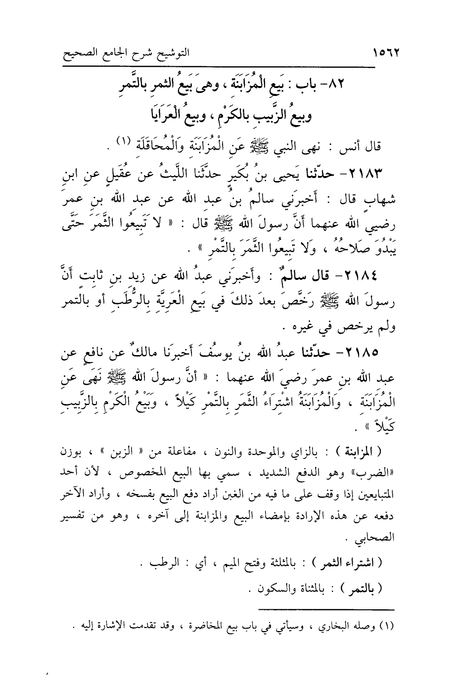2185 - حَدَّثَنَا عَبْدُ اللَّهِ بْنُ يُوسُفَ، أَخْبَرَنَا مَالِكٌ، عَنْ نَافِعٍ، عَنْ عَبْدِ اللَّهِ بْنِ عُمَرَ رَضِيَ اللَّهُ عَنْهُمَا: " أَنَّ رَسُولَ اللَّهِ صَلَّى اللهُ عَلَيْهِ وَسَلَّمَ نَهَى عَنِ المُزَابَنَةِ، وَالمُزَابَنَةُ: اشْتِرَاءُ الثَّمَرِ بِالتَّمْرِ كَيْلًا، وَبَيْعُ الكَرْمِ بِالزَّبِيبِ كَيْلًا".