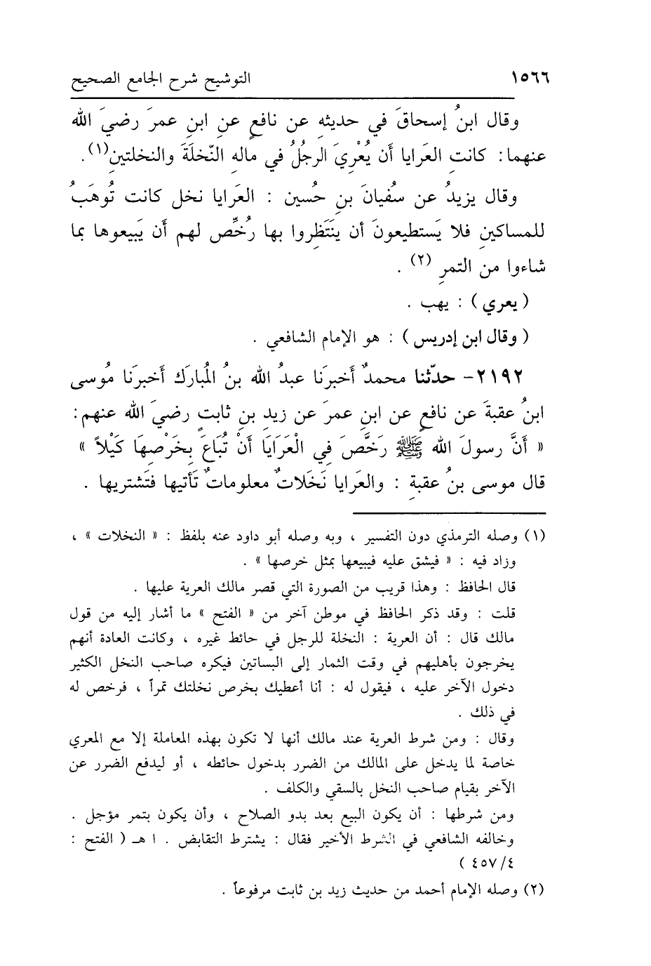 2192 - حَدَّثَنَا مُحَمَّدٌ هُوَ ابْنُ مُقَاتِلٍ، أَخْبَرَنَا عَبْدُ اللَّهِ، أَخْبَرَنَا مُوسَى بْنُ عُقْبَةَ، عَنْ نَافِعٍ، عَنِ ابْنِ عُمَرَ، عَنْ زَيْدِ بْنِ ثَابِتٍ رَضِيَ اللَّهُ عَنْهُمْ: «أَنَّ رَسُولَ اللَّهِ صَلَّى اللهُ عَلَيْهِ وَسَلَّمَ رَخَّصَ فِي العَرَايَا أَنْ تُبَاعَ بِخَرْصِهَا كَيْلًا» قَالَ مُوسَى بْنُ عُقْبَةَ وَالعَرَايَا: «نَخَلاَتٌ مَعْلُومَاتٌ تَأْتِيهَا فَتَشْتَرِيهَا».