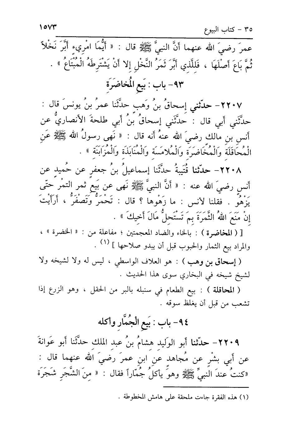 2208 - حَدَّثَنَا قُتَيْبَةُ، حَدَّثَنَا إِسْمَاعِيلُ بْنُ جَعْفَرٍ، عَنْ حُمَيْدٍ، عَنْ أَنَسٍ رَضِيَ اللَّهُ عَنْهُ: «أَنَّ النَّبِيَّ صَلَّى اللهُ عَلَيْهِ وَسَلَّمَ نَهَى عَنْ بَيْعِ ثَمَرِ التَّمْرِ حَتَّى يَزْهُوَ»، فَقُلْنَا لِأَنَسٍ: مَا زَهْوُهَا؟ قَالَ: «تَحْمَرُّ وَتَصْفَرُّ، أَرَأَيْتَ إِنْ مَنَعَ اللَّهُ الثَّمَرَةَ بِمَ تَسْتَحِلُّ مَالَ أَخِيكَ».