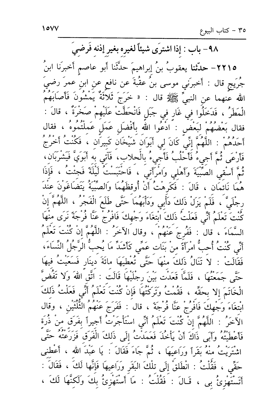 2215 - حَدَّثَنَا يَعْقُوبُ بْنُ إِبْرَاهِيمَ، حَدَّثَنَا أَبُو عَاصِمٍ، أَخْبَرَنَا ابْنُ جُرَيْجٍ، قَالَ: أَخْبَرَنِي مُوسَى بْنُ عُقْبَةَ، عَنْ نَافِعٍ، عَنِ ابْنِ عُمَرَ رَضِيَ اللَّهُ عَنْهُمَا، عَنِ النَّبِيِّ صَلَّى اللهُ عَلَيْهِ وَسَلَّمَ، قَالَ: "خَرَجَ ثَلاَثَةُ نَفَرٍ يَمْشُونَ فَأَصَابَهُمُ المَطَرُ، فَدَخَلُوا فِي غَارٍ فِي جَبَلٍ، فَانْحَطَّتْ عَلَيْهِمْ صَخْرَةٌ، قَالَ: فَقَالَ بَعْضُهُمْ لِبَعْضٍ: ادْعُوا اللَّهَ بِأَفْضَلِ عَمَلٍ عَمِلْتُمُوهُ، فَقَالَ أَحَدُهُمْ: اللَّهُمَّ إِنِّي كَانَ لِي أَبَوَانِ شَيْخَانِ كَبِيرَانِ، فَكُنْتُ أَخْرُجُ فَأَرْعَى، ثُمَّ أَجِيءُ فَأَحْلُبُ فَأَجِيءُ بِالحِلاَبِ، فَآتِي بِهِ أَبَوَيَّ فَيَشْرَبَانِ، ثُمَّ أَسْقِي الصِّبْيَةَ وَأَهْلِي وَامْرَأَتِي، فَاحْتَبَسْتُ لَيْلَةً، فَجِئْتُ فَإِذَا هُمَا نَائِمَانِ، قَالَ: فَكَرِهْتُ أَنْ أُوقِظَهُمَا، وَالصِّبْيَةُ يَتَضَاغَوْنَ عِنْدَ رِجْلَيَّ، فَلَمْ يَزَلْ ذَلِكَ دَأْبِي وَدَأْبَهُمَا، حَتَّى طَلَعَ الفَجْرُ، اللَّهُمَّ إِنْ كُنْتَ تَعْلَمُ أَنِّي فَعَلْتُ ذَلِكَ ابْتِغَاءَ وَجْهِكَ، فَافْرُجْ عَنَّا فُرْجَةً نَرَى مِنْهَا السَّمَاءَ، قَالَ: فَفُرِجَ عَنْهُمْ، وَقَالَ الآخَرُ: اللَّهُمَّ إِنْ كُنْتَ تَعْلَمُ أَنِّي كُنْتُ أُحِبُّ امْرَأَةً مِنْ بَنَاتِ عَمِّي كَأَشَدِّ مَا يُحِبُّ الرَّجُلُ النِّسَاءَ، فَقَالَتْ: لاَ تَنَالُ ذَلِكَ مِنْهَا حَتَّى تُعْطِيَهَا مِائَةَ دِينَارٍ، فَسَعَيْتُ فِيهَا حَتَّى جَمَعْتُهَا، فَلَمَّا قَعَدْتُ بَيْنَ رِجْلَيْهَا قَالَتْ: اتَّقِ اللَّهَ وَلاَ تَفُضَّ الخَاتَمَ إِلَّا بِحَقِّهِ، فَقُمْتُ وَتَرَكْتُهَا، فَإِنْ كُنْتَ تَعْلَمُ أَنِّي فَعَلْتُ ذَلِكَ ابْتِغَاءَ وَجْهِكَ، فَافْرُجْ عَنَّا فُرْجَةً، قَالَ: فَفَرَجَ عَنْهُمُ الثُّلُثَيْنِ، وَقَالَ الآخَرُ: اللَّهُمَّ إِنْ كُنْتَ تَعْلَمُ أَنِّي اسْتَأْجَرْتُ أَجِيرًا بِفَرَقٍ مِنْ ذُرَةٍ فَأَعْطَيْتُهُ، وَأَبَى ذَاكَ أَنْ يَأْخُذَ، فَعَمَدْتُ إِلَى ذَلِكَ الفَرَقِ فَزَرَعْتُهُ، حَتَّى اشْتَرَيْتُ مِنْهُ بَقَرًا وَرَاعِيهَا، ثُمَّ جَاءَ فَقَالَ: يَا عَبْدَ اللَّهِ أَعْطِنِي حَقِّي، فَقُلْتُ: انْطَلِقْ إِلَى تِلْكَ البَقَرِ وَرَاعِيهَا فَإِنَّهَا لَكَ، فَقَالَ: أَتَسْتَهْزِئُ بِي؟ قَالَ: فَقُلْتُ: مَا أَسْتَهْزِئُ بِكَ وَلَكِنَّهَا لَكَ