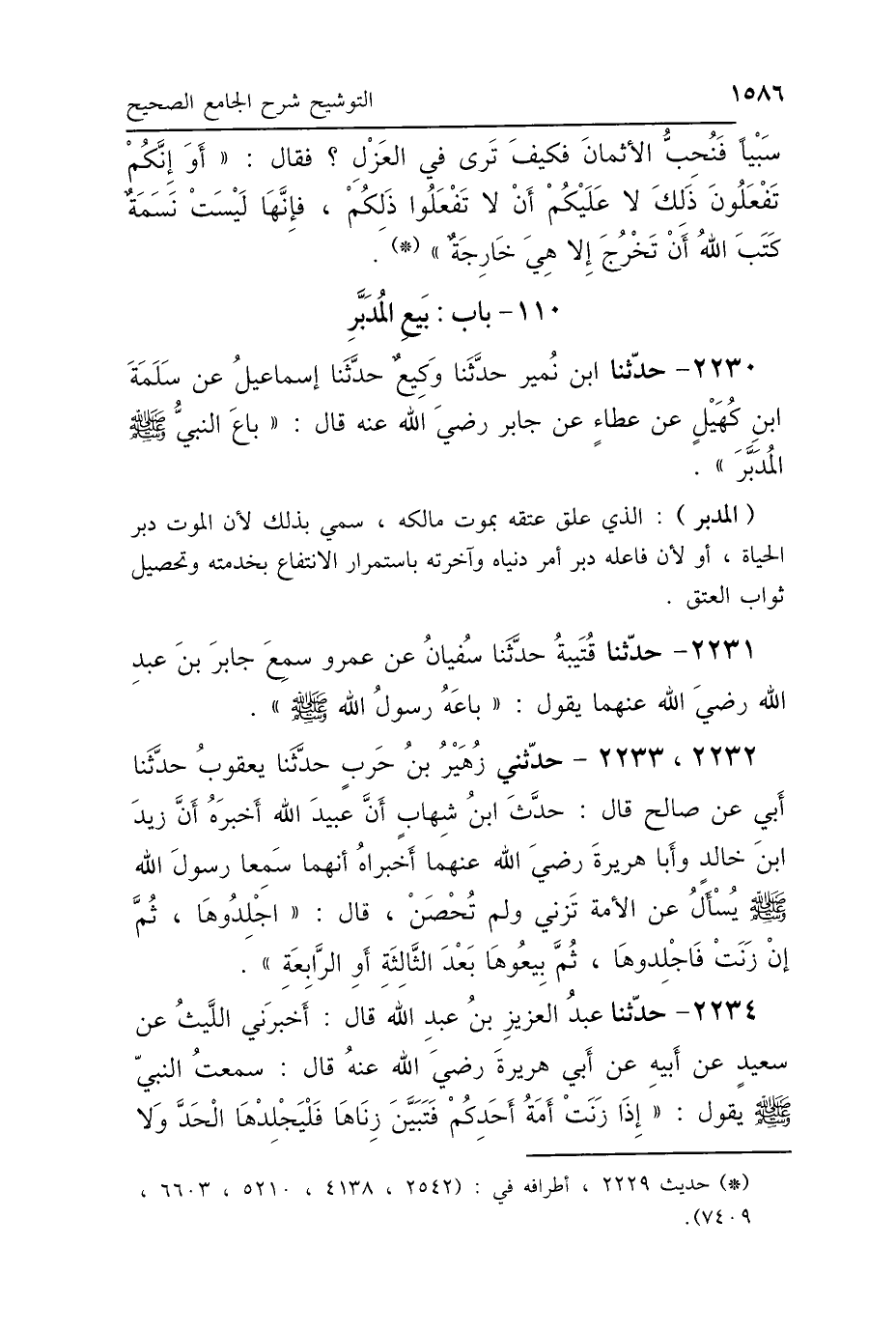 2230 - حَدَّثَنَا ابْنُ نُمَيْرٍ، حَدَّثَنَا وَكِيعٌ، حَدَّثَنَا إِسْمَاعِيلُ، عَنْ سَلَمَةَ بْنِ كُهَيْلٍ، عَنْ عَطَاءٍ، عَنْ جَابِرٍ رَضِيَ اللَّهُ عَنْهُ، قَالَ: «بَاعَ النَّبِيُّ صَلَّى اللهُ عَلَيْهِ وَسَلَّمَ المُدَبَّرَ».