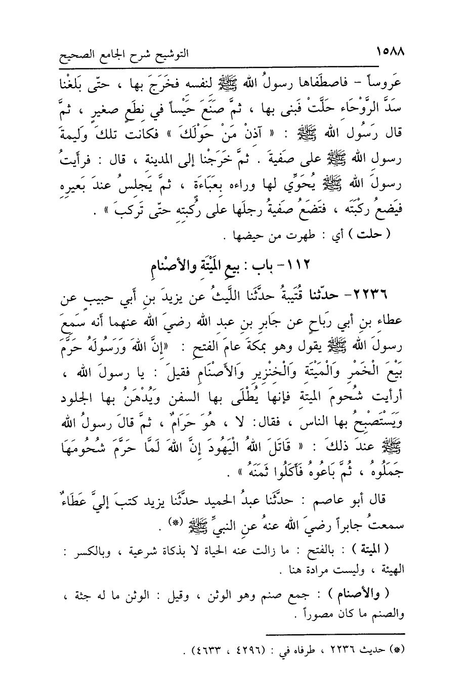 2236 - حَدَّثَنَا قُتَيْبَةُ، حَدَّثَنَا اللَّيْثُ، عَنْ يَزِيدَ بْنِ أَبِي حَبِيبٍ، عَنْ عَطَاءِ بْنِ أَبِي رَبَاحٍ، عَنْ جَابِرِ بْنِ عَبْدِ اللَّهِ رَضِيَ اللَّهُ عَنْهُمَا، أَنَّهُ: سَمِعَ رَسُولَ اللَّهِ صَلَّى اللهُ عَلَيْهِ وَسَلَّمَ، يَقُولُ عَامَ الفَتْحِ وَهُوَ بِمَكَّةَ: «إِنَّ اللَّهَ وَرَسُولَهُ حَرَّمَ بَيْعَ الخَمْرِ، وَالمَيْتَةِ وَالخِنْزِيرِ وَالأَصْنَامِ»، فَقِيلَ: يَا رَسُولَ اللَّهِ، أَرَأَيْتَ شُحُومَ المَيْتَةِ، فَإِنَّهَا يُطْلَى بِهَا السُّفُنُ، وَيُدْهَنُ بِهَا الجُلُودُ، وَيَسْتَصْبِحُ بِهَا النَّاسُ؟ فَقَالَ: «لاَ، هُوَ حَرَامٌ»، ثُمَّ قَالَ رَسُولُ اللَّهِ صَلَّى اللهُ عَلَيْهِ وَسَلَّمَ عِنْدَ ذَلِكَ: «قَاتَلَ اللَّهُ اليَهُودَ إِنَّ اللَّهَ لَمَّا حَرَّمَ شُحُومَهَا جَمَلُوهُ، ثُمَّ بَاعُوهُ، فَأَكَلُوا ثَمَنَهُ»، قَالَ أَبُو عَاصِمٍ، حَدَّثَنَا عَبْدُ الحَمِيدِ، حَدَّثَنَا يَزِيدُ، كَتَبَ إِلَيَّ عَطَاءٌ، سَمِعْتُ جَابِرًا رَضِيَ اللَّهُ عَنْهُ، عَنِ النَّبِيِّ صَلَّى اللهُ عَلَيْهِ وَسَلَّمَ.