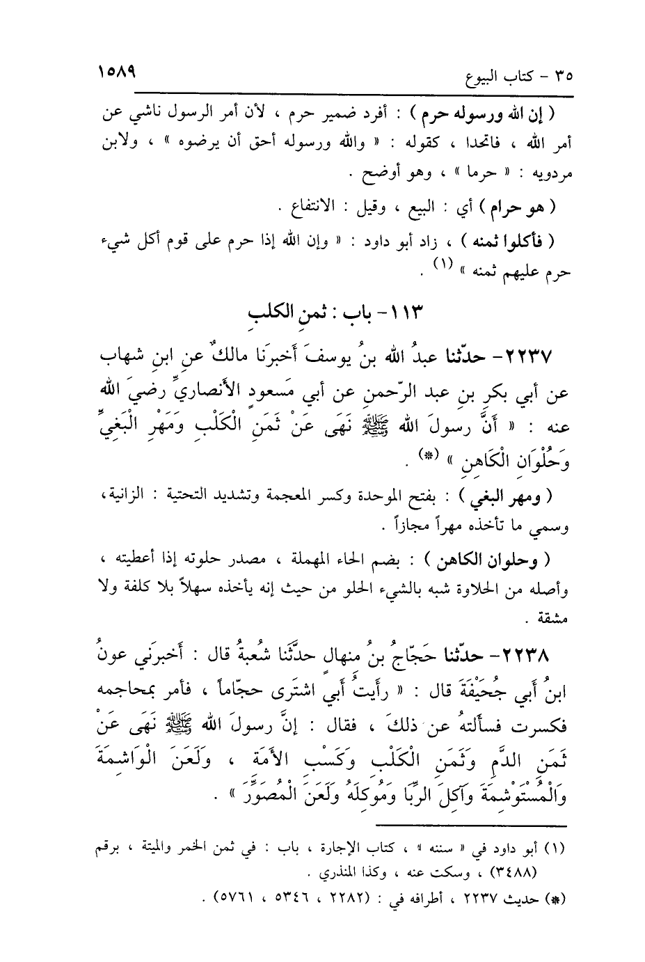 2237 - حَدَّثَنَا عَبْدُ اللَّهِ بْنُ يُوسُفَ، أَخْبَرَنَا مَالِكٌ، عَنِ ابْنِ شِهَابٍ، عَنْ أَبِي بَكْرِ بْنِ عَبْدِ الرَّحْمَنِ، عَنْ أَبِي مَسْعُودٍ الأَنْصَارِيِّ رَضِيَ اللَّهُ عَنْهُ: «أَنَّ رَسُولَ اللَّهِ صَلَّى اللهُ عَلَيْهِ وَسَلَّمَ نَهَى عَنْ ثَمَنِ الكَلْبِ، وَمَهْرِ البَغِيِّ، وَحُلْوَانِ الكَاهِنِ».