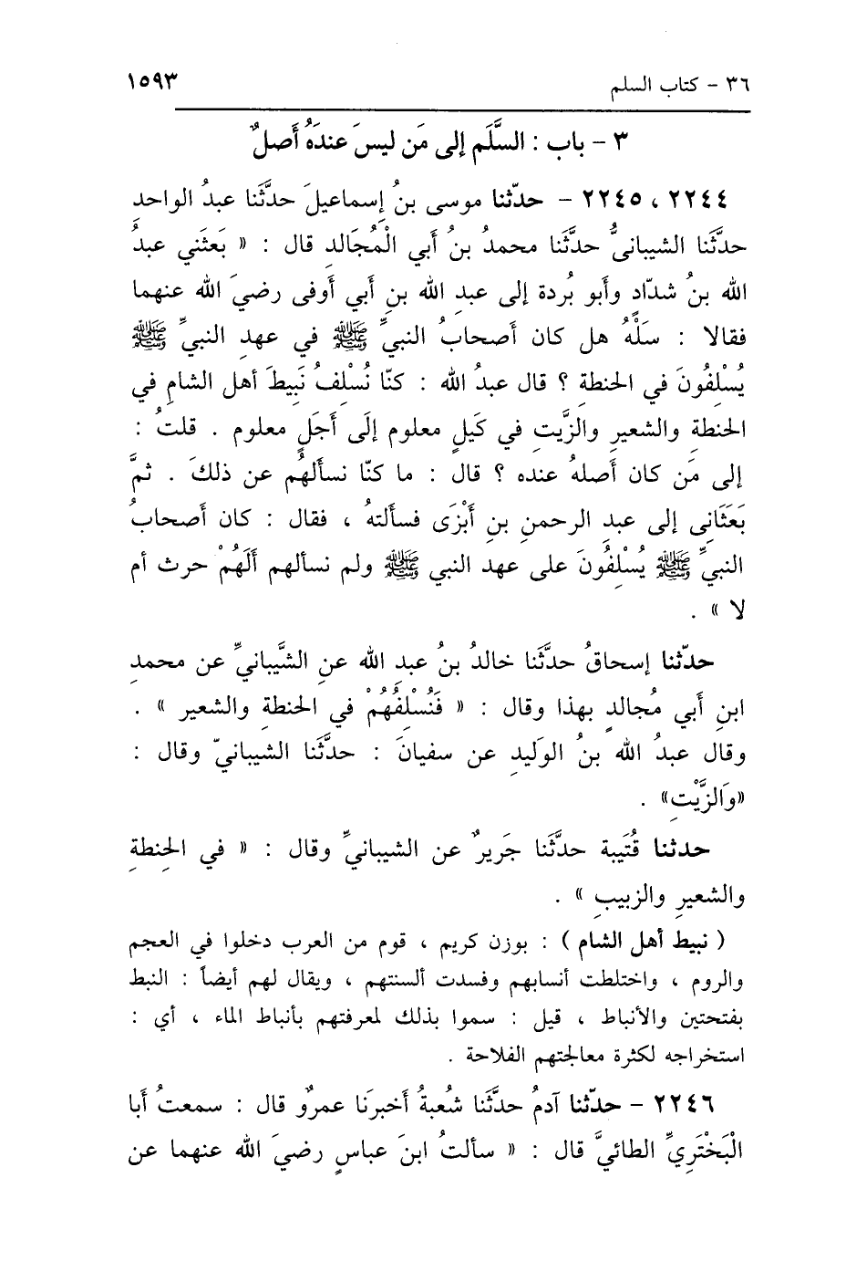 2244، 2245 - حَدَّثَنَا مُوسَى بْنُ إِسْمَاعِيلَ، حَدَّثَنَا عَبْدُ الوَاحِدِ، حَدَّثَنَا الشَّيْبَانِيُّ، حَدَّثَنَا مُحَمَّدُ بْنُ أَبِي المُجَالِدِ، قَالَ: بَعَثَنِي عَبْدُ اللَّهِ بْنُ شَدَّادٍ، وَأَبُو بُرْدَةَ إِلَى عَبْدِ اللَّهِ بْنِ أَبِي أَوْفَى رَضِيَ اللَّهُ عَنْهُمَا، فَقَالاَ: سَلْهُ، هَلْ كَانَ أَصْحَابُ النَّبِيِّ صَلَّى اللهُ عَلَيْهِ وَسَلَّمَ فِي عَهْدِ النَّبِيِّ صَلَّى اللهُ عَلَيْهِ وَسَلَّمَ يُسْلِفُونَ فِي الحِنْطَةِ؟ قَالَ: عَبْدُ اللَّهِ «كُنَّا نُسْلِفُ نَبِيطَ أَهْلِ الشَّأْمِ فِي الحِنْطَةِ، وَالشَّعِيرِ، وَالزَّيْتِ، فِي كَيْلٍ مَعْلُومٍ إِلَى أَجَلٍ مَعْلُومٍ»، قُلْتُ: إِلَى مَنْ كَانَ أَصْلُهُ عِنْدَهُ؟ قَالَ: مَا كُنَّا نَسْأَلُهُمْ عَنْ ذَلِكَ، ثُمَّ بَعَثَانِي إِلَى عَبْدِ الرَّحْمَنِ بْنِ أَبْزَى فَسَأَلْتُهُ، فَقَالَ: «كَانَ أَصْحَابُ النَّبِيِّ صَلَّى اللهُ عَلَيْهِ وَسَلَّمَ يُسْلِفُونَ عَلَى عَهْدِ النَّبِيِّ صَلَّى اللهُ عَلَيْهِ وَسَلَّمَ»، وَلَمْ نَسْأَلْهُمْ: أَلَهُمْ حَرْثٌ أَمْ لاَ؟. حَدَّثَنَا إِسْحَاقُ، حَدَّثَنَا خَالِدُ بْنُ عَبْدِ اللَّهِ، عَنِ الشَّيْبَانِيِّ، عَنْ مُحَمَّدِ بْنِ أَبِي مُجَالِدٍ، بِهَذَا، وَقَالَ: فَنُسْلِفُهُمْ فِي الحِنْطَةِ وَالشَّعِيرِ، وَقَالَ عَبْدُ اللَّهِ بْنُ الوَلِيدِ، عَنْ سُفْيَانَ، حَدَّثَنَا الشَّيْبَانِيُّ، وَقَالَ: «وَالزَّيْتِ»، حَدَّثَنَا قُتَيْبَةُ، حَدَّثَنَا جَرِيرٌ، عَنِ الشَّيْبَانِيِّ، وَقَالَ: «فِي الحِنْطَةِ وَالشَّعِيرِ وَالزَّبِيبِ».