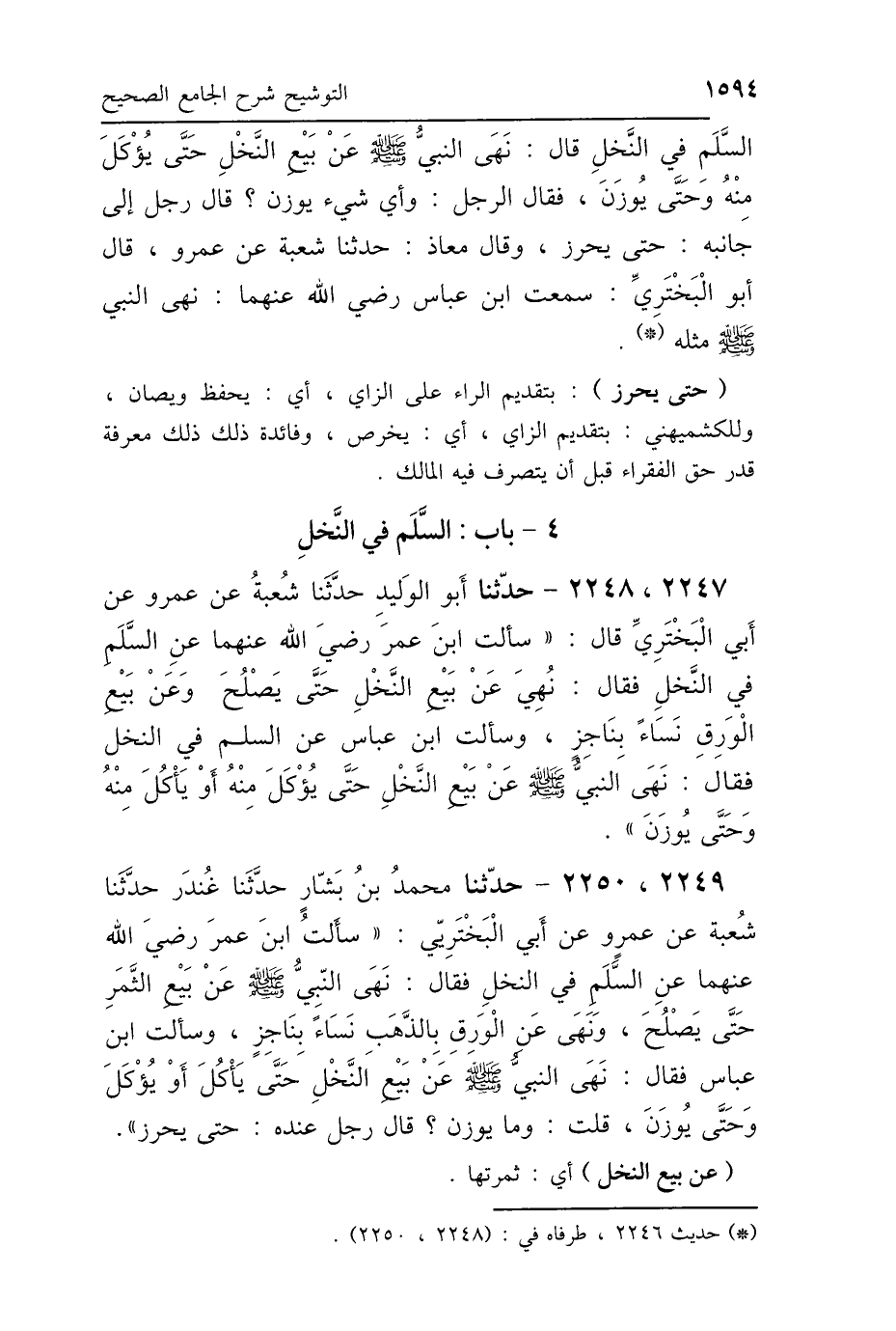 2249، 2250 - حَدَّثَنَا مُحَمَّدُ بْنُ بَشَّارٍ، حَدَّثَنَا غُنْدَرٌ، حَدَّثَنَا شُعْبَةُ، عَنْ عَمْرٍو، عَنْ أَبِي البَخْتَرِيِّ، سَأَلْتُ ابْنَ عُمَرَ رَضِيَ اللَّهُ عَنْهُمَا، عَنِ السَّلَمِ فِي النَّخْلِ، فَقَالَ: «نَهَى النَّبِيُّ صَلَّى اللهُ عَلَيْهِ وَسَلَّمَ عَنْ بَيْعِ الثَّمَرِ حَتَّى يَصْلُحَ، وَنَهَى عَنِ الوَرِقِ بِالذَّهَبِ نَسَاءً بِنَاجِزٍ». وَسَأَلْتُ ابْنَ عَبَّاسٍ فَقَالَ: «نَهَى النَّبِيُّ صَلَّى اللهُ عَلَيْهِ وَسَلَّمَ عَنْ بَيْعِ النَّخْلِ حَتَّى يَأْكُلَ، أَوْ يُؤْكَلَ، وَحَتَّى يُوزَنَ» قُلْتُ: وَمَا يُوزَنُ؟ قَالَ رَجُلٌ: عِنْدَهُ حَتَّى يُحْرَزَ.