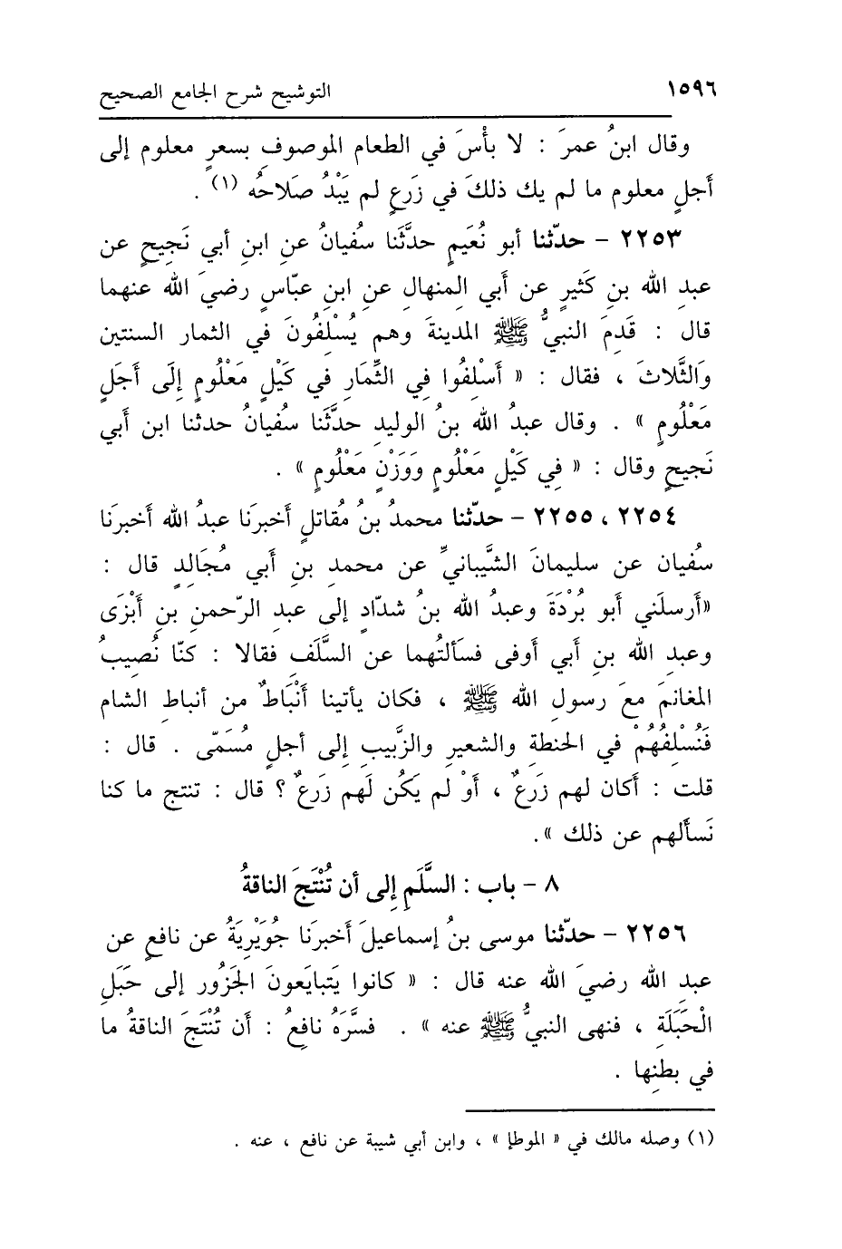 2253 - حَدَّثَنَا أَبُو نُعَيْمٍ، حَدَّثَنَا سُفْيَانُ، عَنِ ابْنِ أَبِي نَجِيحٍ، عَنْ عَبْدِ اللَّهِ بْنِ كَثِيرٍ، عَنْ أَبِي المِنْهَالِ، عَنِ ابْنِ عَبَّاسٍ رَضِيَ اللَّهُ عَنْهُمَا، قَالَ: قَدِمَ النَّبِيُّ صَلَّى اللهُ عَلَيْهِ وَسَلَّمَ المَدِينَةَ وَهُمْ يُسْلِفُونَ فِي الثِّمَارِ السَّنَتَيْنِ وَالثَّلاَثَ، فَقَالَ: «أَسْلِفُوا فِي الثِّمَارِ فِي كَيْلٍ مَعْلُومٍ إِلَى أَجَلٍ مَعْلُومٍ»، وَقَالَ عَبْدُ اللَّهِ بْنُ الوَلِيدِ: حَدَّثَنَا سُفْيَانُ، حَدَّثَنَا ابْنُ أَبِي نَجِيحٍ، وَقَالَ: «فِي كَيْلٍ مَعْلُومٍ، وَوَزْنٍ مَعْلُومٍ».