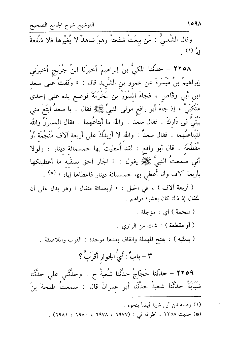 2258 - حَدَّثَنَا المَكِّيُّ بْنُ إِبْرَاهِيمَ، أَخْبَرَنَا ابْنُ جُرَيْجٍ، أَخْبَرَنِي إِبْرَاهِيمُ بْنُ مَيْسَرَةَ، عَنْ عَمْرِو بْنِ الشَّرِيدِ، قَالَ: وَقَفْتُ عَلَى سَعْدِ بْنِ أَبِي وَقَّاصٍ، فَجَاءَ المِسْوَرُ بْنُ مَخْرَمَةَ، فَوَضَعَ يَدَهُ عَلَى إِحْدَى مَنْكِبَيَّ، إِذْ جَاءَ أَبُو رَافِعٍ مَوْلَى النَّبِيِّ صَلَّى اللهُ عَلَيْهِ وَسَلَّمَ، فَقَالَ: يَا سَعْدُ ابْتَعْ مِنِّي بَيْتَيَّ فِي دَارِكَ؟ فَقَالَ سَعْدٌ: وَاللَّهِ مَا أَبْتَاعُهُمَا، فَقَالَ المِسْوَرُ: وَاللَّهِ لَتَبْتَاعَنَّهُمَا، فَقَالَ سَعْدٌ: وَاللَّهِ لاَ أَزِيدُكَ عَلَى أَرْبَعَةِ آلاَفٍ مُنَجَّمَةً، أَوْ مُقَطَّعَةً، قَالَ أَبُو رَافِعٍ: لَقَدْ أُعْطِيتُ بِهَا خَمْسَ مِائَةِ دِينَارٍ، وَلَوْلاَ أَنِّي سَمِعْتُ النَّبِيَّ صَلَّى اللهُ عَلَيْهِ وَسَلَّمَ يَقُولُ: «الجَارُ أَحَقُّ بِسَقَبِهِ»، مَا أَعْطَيْتُكَهَا بِأَرْبَعَةِ آلاَفٍ، وَأَنَا أُعْطَى بِهَا خَمْسَ مِائَةِ دِينَارٍ، فَأَعْطَاهَا إِيَّاهُ.