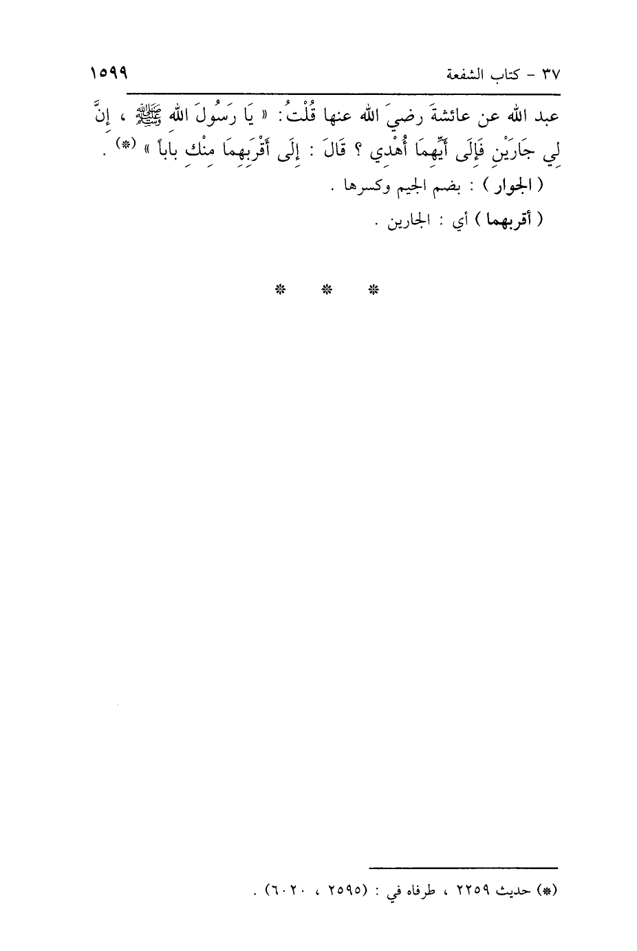 عَبْدِ اللَّهِ، عَنْ عَائِشَةَ رَضِيَ اللَّهُ عَنْهَا، قُلْتُ: يَا رَسُولَ اللَّهِ، إِنَّ لِي جَارَيْنِ فَإِلَى أَيِّهِمَا أُهْدِي؟ قَالَ: «إِلَى أَقْرَبِهِمَا مِنْكِ بَابًا».
