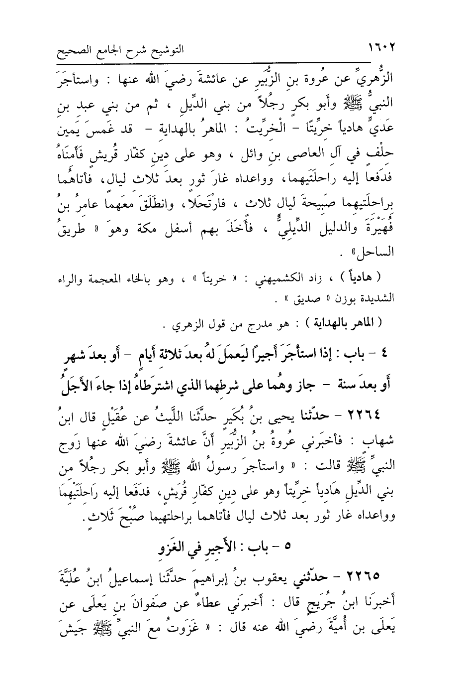 الزُّهْرِيِّ، عَنْ عُرْوَةَ بْنِ الزُّبَيْرِ، عَنْ عَائِشَةَ رَضِيَ اللَّهُ عَنْهَا: " وَاسْتَأْجَرَ النَّبِيُّ صَلَّى اللهُ عَلَيْهِ وَسَلَّمَ، وَأَبُو بَكْرٍ رَجُلًا مِنْ بَنِي الدِّيلِ، ثُمَّ مِنْ بَنِي عَبْدِ بْنِ عَدِيٍّ هَادِيًا خِرِّيتًا - الخِرِّيتُ: المَاهِرُ بِالهِدَايَةِ - قَدْ غَمَسَ يَمِينَ حِلْفٍ فِي آلِ العَاصِ بْنِ وَائِلٍ، وَهُوَ عَلَى دِينِ كُفَّارِ قُرَيْشٍ، فَأَمِنَاهُ فَدَفَعَا إِلَيْهِ رَاحِلَتَيْهِمَا، وَوَاعَدَاهُ غَارَ ثَوْرٍ بَعْدَ ثَلاَثِ لَيَالٍ، فَأَتَاهُمَا بِرَاحِلَتَيْهِمَا صَبِيحَةَ لَيَالٍ ثَلاَثٍ، فَارْتَحَلاَ وَانْطَلَقَ مَعَهُمَا عَامِرُ بْنُ فُهَيْرَةَ، وَالدَّلِيلُ الدِّيلِيُّ، فَأَخَذَ بِهِمْ أَسْفَلَ مَكَّةَ وَهُوَ طَرِيقُ السَّاحِلِ".