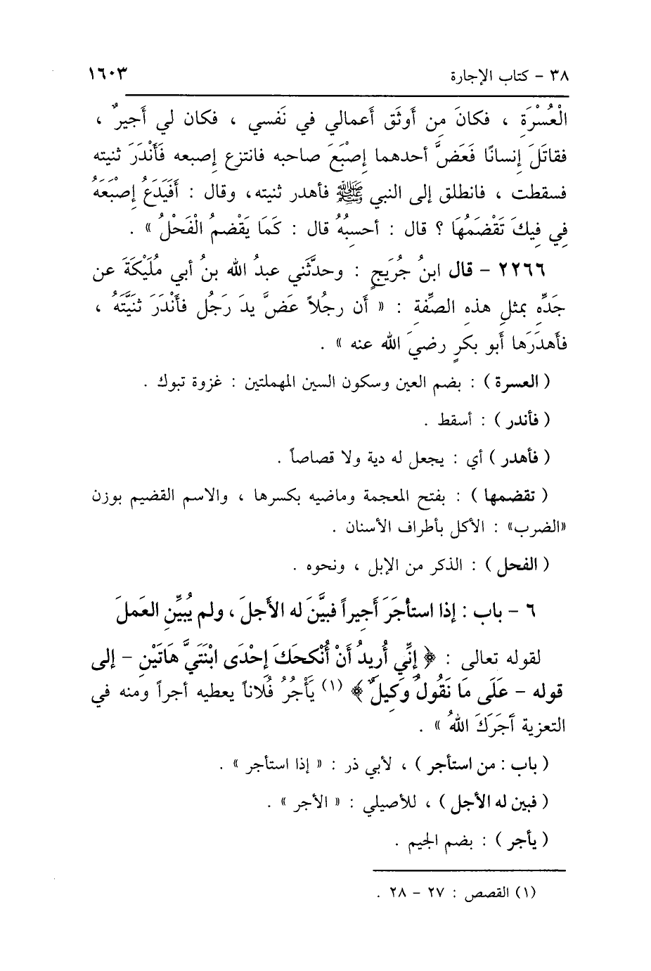 العُسْرَةِ، فَكَانَ مِنْ أَوْثَقِ أَعْمَالِي فِي نَفْسِي، فَكَانَ لِي أَجِيرٌ، فَقَاتَلَ إِنْسَانًا، فَعَضَّ أَحَدُهُمَا إِصْبَعَ صَاحِبِهِ، فَانْتَزَعَ إِصْبَعَهُ، فَأَنْدَرَ ثَنِيَّتَهُ، فَسَقَطَتْ، فَانْطَلَقَ إِلَى النَّبِيِّ صَلَّى اللهُ عَلَيْهِ وَسَلَّمَ فَأَهْدَرَ ثَنِيَّتَهُ، وَقَالَ: " أَفَيَدَعُ إِصْبَعَهُ فِي فِيكَ تَقْضَمُهَا - قَالَ: أَحْسِبُهُ قَالَ - كَمَا يَقْضَمُ الفَحْلُ".