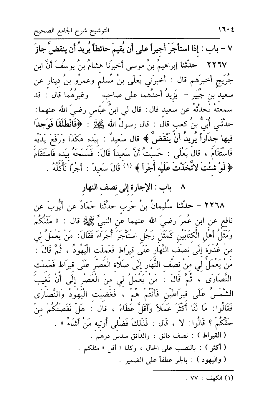 2267 - حَدَّثَنَا إِبْرَاهِيمُ بْنُ مُوسَى، أَخْبَرَنَا هِشَامُ بْنُ يُوسُفَ، أَنَّ ابْنَ جُرَيْجٍ أَخْبَرَهُمْ، قَالَ: أَخْبَرَنِي يَعْلَى بْنُ مُسْلِمٍ، وَعَمْرُو بْنُ دِينَارٍ، عَنْ سَعِيدِ بْنِ جُبَيْرٍ - يَزِيدُ أَحَدُهُمَا عَلَى صَاحِبِهِ، وَغَيْرُهُمَا قَالَ: قَدْ سَمِعْتُهُ يُحَدِّثُهُ عَنْ سَعِيدٍ - قَالَ: قَالَ لِي ابْنُ عَبَّاسٍ رَضِيَ اللَّهُ عَنْهُمَا: حَدَّثَنِي أُبَيُّ بْنُ كَعْبٍ، قَالَ: قَالَ رَسُولُ اللَّهِ صَلَّى اللهُ عَلَيْهِ وَسَلَّمَ: " فَانْطَلَقَا، فَوَجَدَا جِدَارًا يُرِيدُ أَنْ يَنْقَضَّ - قَالَ سَعِيدٌ: بِيَدِهِ هَكَذَا، وَرَفَعَ يَدَيْهِ -، فَاسْتَقَامَ "، قَالَ يَعْلَى: حَسِبْتُ أَنْ سَعِيدًا، قَالَ: " فَمَسَحَهُ بِيَدِهِ، فَاسْتَقَامَ، {لَوْ شِئْتَ لاَتَّخَذْتَ عَلَيْهِ أَجْرًا} [الكهف: 77] " قَالَ سَعِيدٌ: «أَجْرًا نَأْكُلُهُ».