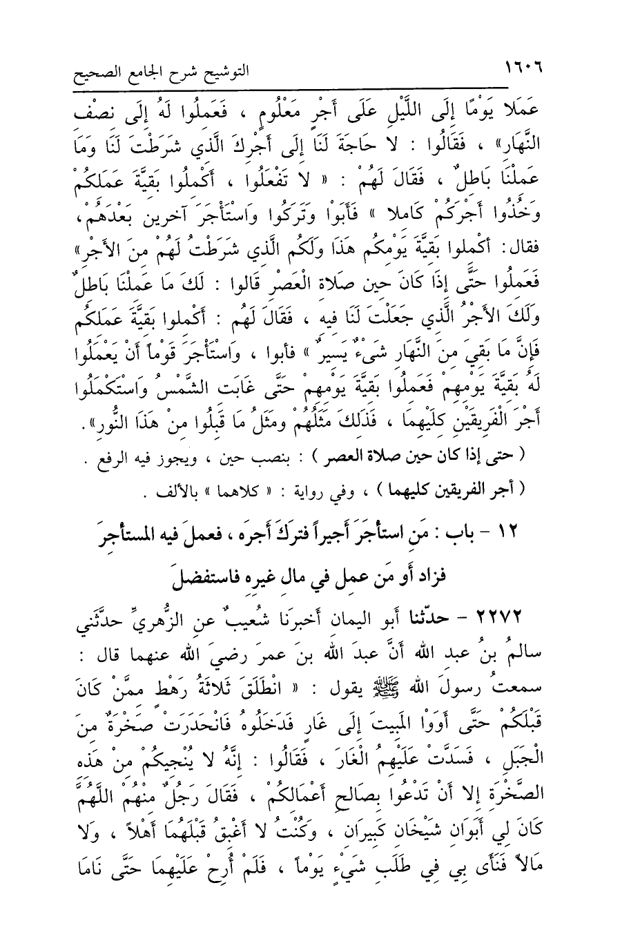 عَمَلًا يَوْمًا إِلَى اللَّيْلِ، عَلَى أَجْرٍ مَعْلُومٍ، فَعَمِلُوا لَهُ إِلَى نِصْفِ النَّهَارِ، فَقَالُوا: لاَ حَاجَةَ لَنَا إِلَى أَجْرِكَ الَّذِي شَرَطْتَ لَنَا وَمَا عَمِلْنَا بَاطِلٌ، فَقَالَ لَهُمْ: لاَ تَفْعَلُوا، أَكْمِلُوا بَقِيَّةَ عَمَلِكُمْ، وَخُذُوا أَجْرَكُمْ كَامِلًا، فَأَبَوْا، وَتَرَكُوا، وَاسْتَأْجَرَ أَجِيرَيْنِ بَعْدَهُمْ، فَقَالَ لَهُمَا: أَكْمِلاَ بَقِيَّةَ يَوْمِكُمَا هَذَا وَلَكُمَا الَّذِي شَرَطْتُ لَهُمْ مِنَ الأَجْرِ، فَعَمِلُوا حَتَّى إِذَا كَانَ حِينُ صَلاَةِ العَصْرِ، قَالاَ: لَكَ مَا عَمِلْنَا بَاطِلٌ، وَلَكَ الأَجْرُ الَّذِي جَعَلْتَ لَنَا فِيهِ، فَقَالَ لَهُمَا: أَكْمِلاَ بَقِيَّةَ عَمَلِكُمَا مَا بَقِيَ مِنَ النَّهَارِ شَيْءٌ يَسِيرٌ، فَأَبَيَا، وَاسْتَأْجَرَ قَوْمًا أَنْ يَعْمَلُوا لَهُ بَقِيَّةَ يَوْمِهِمْ، فَعَمِلُوا بَقِيَّةَ يَوْمِهِمْ حَتَّى غَابَتِ الشَّمْسُ، وَاسْتَكْمَلُوا أَجْرَ الفَرِيقَيْنِ كِلَيْهِمَا، فَذَلِكَ مَثَلُهُمْ، وَمَثَلُ مَا قَبِلُوا مِنْ هَذَا النُّورِ".