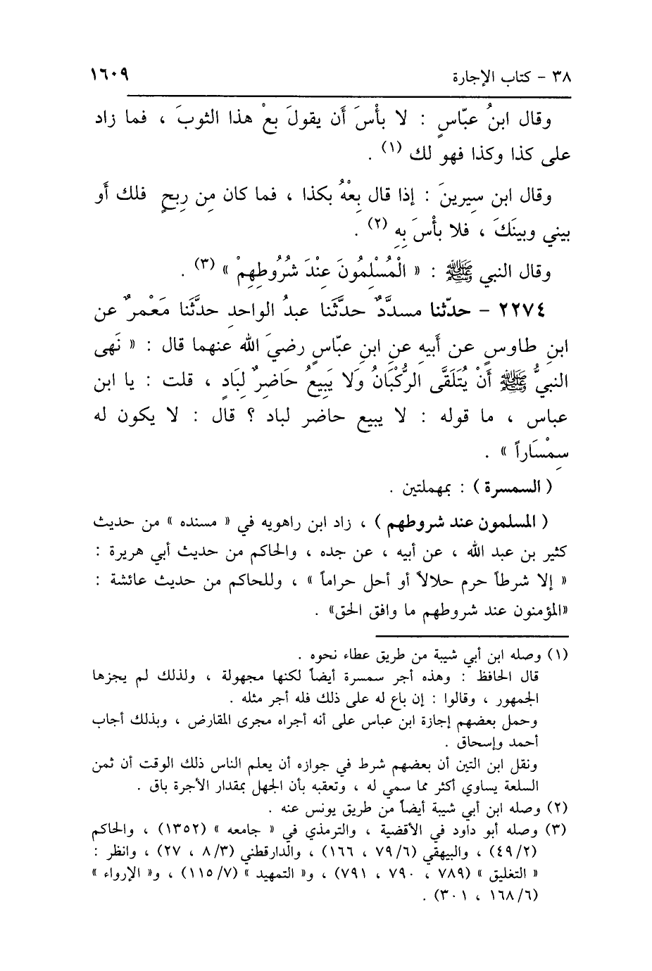 (المسلمون عند شروطهم)، زاد ابن راهويه في "مسنده" من حديث كثير بن عبد الله، عن أبيه، عن جده، والحاكم من حديث أبي هريرة: "إلا شرطًا حرم حلالًا أو أحل حرامًا"، وللحاكم من حديث عائشة: "المؤمنون عند شروطهم ما وافق الحق".