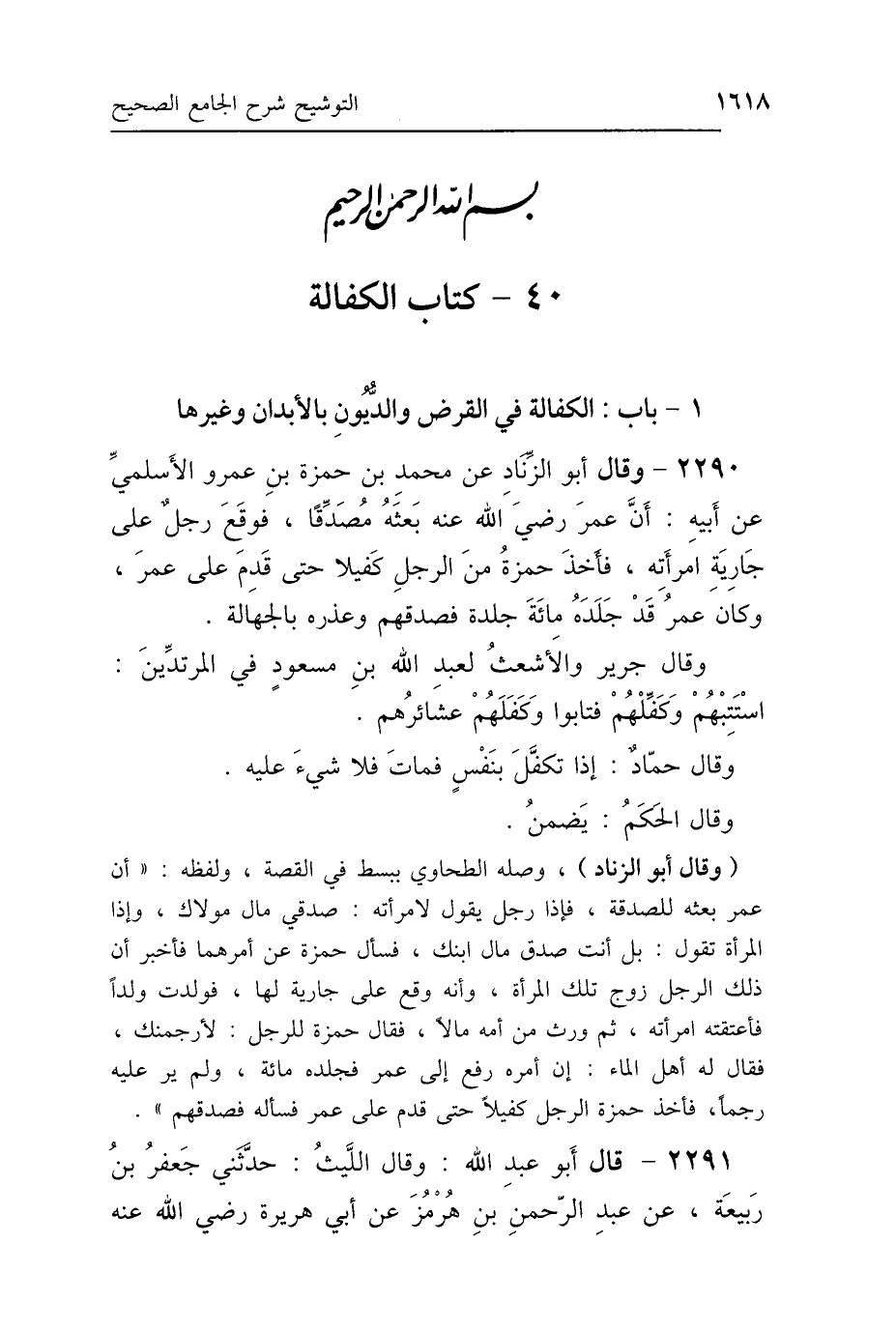 2290 - وَقَالَ أَبُو الزِّنَادِ: عَنْ مُحَمَّدِ بْنِ حَمْزَةَ بْنِ عَمْرٍو الأَسْلَمِيِّ، عَنْ أَبِيهِ، أَنَّ عُمَرَ رَضِيَ اللَّهُ عَنْهُ، بَعَثَهُ مُصَدِّقًا، فَوَقَعَ رَجُلٌ عَلَى جَارِيَةِ امْرَأَتِهِ، فَأَخَذَ حَمْزَةُ مِنَ الرَّجُلِ كَفِيلًا حَتَّى قَدِمَ عَلَى عُمَرَ، وَكَانَ عُمَرُ قَدْ جَلَدَهُ مِائَةَ جَلْدَةٍ، فَصَدَّقَهُمْ وَعَذَرَهُ بِالْجَهَالَةِ وَقَالَ جَرِيرٌ، وَالأَشْعَثُ، لِعَبْدِ اللَّهِ بْنِ مَسْعُودٍ: «فِي المُرْتَدِّينَ اسْتَتِبْهُمْ وَكَفِّلْهُمْ، فَتَابُوا، وَكَفَلَهُمْ عَشَائِرُهُمْ» وَقَالَ حَمَّادٌ: «إِذَا تَكَفَّلَ بِنَفْسٍ فَمَاتَ فَلاَ شَيْءَ عَلَيْهِ»، وَقَالَ الحَكَمُ: «يَضْمَنُ».