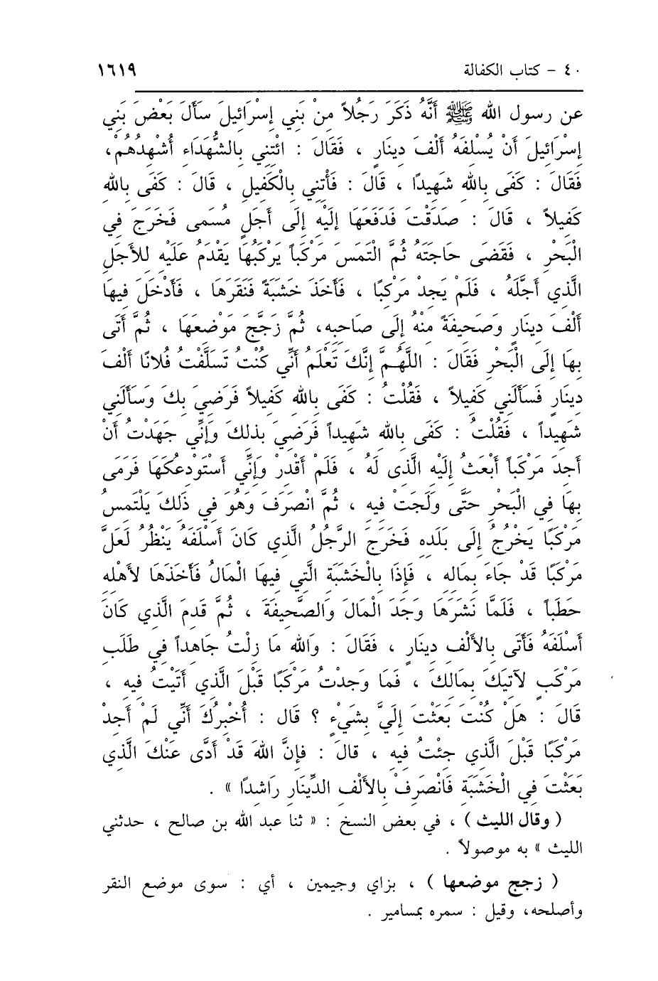 عَنْ رَسُولِ اللَّهِ صَلَّى اللهُ عَلَيْهِ وَسَلَّمَ: " أَنَّهُ ذَكَرَ رَجُلًا مِنْ بَنِي إِسْرَائِيلَ، سَأَلَ بَعْضَ بَنِي إِسْرَائِيلَ أَنْ يُسْلِفَهُ أَلْفَ دِينَارٍ، فَقَالَ: ائْتِنِي بِالشُّهَدَاءِ أُشْهِدُهُمْ، فَقَالَ: كَفَى بِاللَّهِ شَهِيدًا، قَالَ: فَأْتِنِي بِالكَفِيلِ، قَالَ: كَفَى بِاللَّهِ كَفِيلًا، قَالَ: صَدَقْتَ، فَدَفَعَهَا إِلَيْهِ إِلَى أَجَلٍ مُسَمًّى، فَخَرَجَ فِي البَحْرِ فَقَضَى حَاجَتَهُ، ثُمَّ التَمَسَ مَرْكَبًا يَرْكَبُهَا يَقْدَمُ عَلَيْهِ لِلْأَجَلِ الَّذِي أَجَّلَهُ، فَلَمْ يَجِدْ مَرْكَبًا، فَأَخَذَ خَشَبَةً فَنَقَرَهَا، فَأَدْخَلَ فِيهَا أَلْفَ دِينَارٍ وَصَحِيفَةً مِنْهُ إِلَى صَاحِبِهِ، ثُمَّ زَجَّجَ مَوْضِعَهَا، ثُمَّ أَتَى بِهَا إِلَى البَحْرِ، فَقَالَ: اللَّهُمَّ إِنَّكَ تَعْلَمُ أَنِّي كُنْتُ تَسَلَّفْتُ فُلاَنًا أَلْفَ دِينَارٍ، فَسَأَلَنِي كَفِيلاَ، فَقُلْتُ: كَفَى بِاللَّهِ كَفِيلًا، فَرَضِيَ بِكَ، وَسَأَلَنِي شَهِيدًا، فَقُلْتُ: كَفَى بِاللَّهِ شَهِيدًا، فَرَضِيَ بِكَ، وَأَنِّي جَهَدْتُ أَنْ أَجِدَ مَرْكَبًا أَبْعَثُ إِلَيْهِ الَّذِي لَهُ فَلَمْ أَقْدِرْ، وَإِنِّي أَسْتَوْدِعُكَهَا، فَرَمَى بِهَا فِي البَحْرِ حَتَّى وَلَجَتْ فِيهِ، ثُمَّ انْصَرَفَ وَهُوَ فِي ذَلِكَ يَلْتَمِسُ مَرْكَبًا يَخْرُجُ إِلَى بَلَدِهِ، فَخَرَجَ الرَّجُلُ الَّذِي كَانَ أَسْلَفَهُ، يَنْظُرُ لَعَلَّ مَرْكَبًا قَدْ جَاءَ بِمَالِهِ، فَإِذَا بِالخَشَبَةِ الَّتِي فِيهَا المَالُ، فَأَخَذَهَا لِأَهْلِهِ حَطَبًا، فَلَمَّا نَشَرَهَا وَجَدَ المَالَ وَالصَّحِيفَةَ، ثُمَّ قَدِمَ الَّذِي كَانَ أَسْلَفَهُ، فَأَتَى بِالأَلْفِ دِينَارٍ، فَقَالَ: وَاللَّهِ مَا زِلْتُ جَاهِدًا فِي طَلَبِ مَرْكَبٍ لِآتِيَكَ بِمَالِكَ، فَمَا وَجَدْتُ مَرْكَبًا قَبْلَ الَّذِي أَتَيْتُ فِيهِ، قَالَ: هَلْ كُنْتَ بَعَثْتَ إِلَيَّ بِشَيْءٍ؟ قَالَ: أُخْبِرُكَ أَنِّي لَمْ أَجِدْ مَرْكَبًا قَبْلَ الَّذِي جِئْتُ فِيهِ، قَالَ: فَإِنَّ اللَّهَ قَدْ أَدَّى عَنْكَ الَّذِي بَعَثْتَ فِي الخَشَبَةِ، فَانْصَرِفْ بِالأَلْفِ الدِّينَارِ رَاشِدًا".