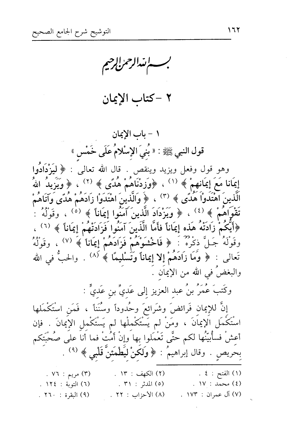 وَكَتَبَ عُمَرُ بْنُ عَبْدِ العَزِيزِ إِلَى عَدِيِّ بْنِ عَدِيٍّ: «إِنَّ لِلْإِيمَانِ فَرَائِضَ، وَشَرَائِعَ، وَحُدُودًا، وَسُنَنًا، فَمَنِ اسْتَكْمَلَهَا اسْتَكْمَلَ الإِيمَانَ، وَمَنْ لَمْ يَسْتَكْمِلْهَا لَمْ يَسْتَكْمِلِ الإِيمَانَ، فَإِنْ أَعِشْ فَسَأُبَيِّنُهَا لَكُمْ حَتَّى تَعْمَلُوا بِهَا، وَإِنْ أَمُتْ فَمَا أَنَا عَلَى صُحْبَتِكُمْ بِحَرِيصٍ» وَقَالَ إِبْرَاهِيمُ صَلَّى اللهُ عَلَيْهِ وَسَلَّمَ: «وَلَكِنْ لِيَطْمَئِنَّ قَلْبِي».