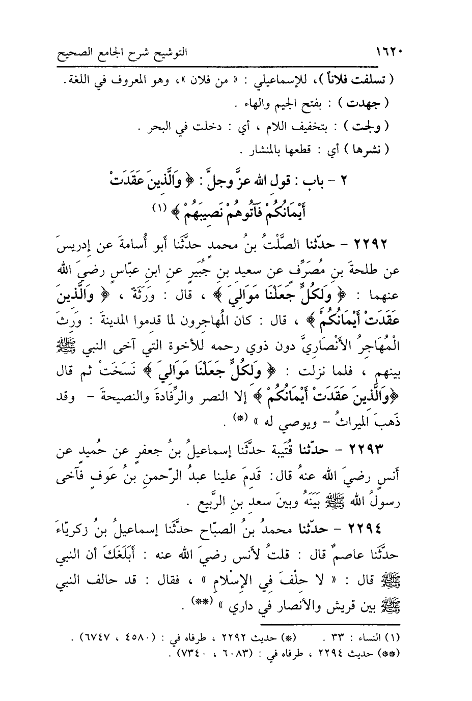 2292 - حَدَّثَنَا الصَّلْتُ بْنُ مُحَمَّدٍ، حَدَّثَنَا أَبُو أُسَامَةَ، عَنْ إِدْرِيسَ، عَنْ طَلْحَةَ بْنِ مُصَرِّفٍ، عَنْ سَعِيدِ بْنِ جُبَيْرٍ، عَنِ ابْنِ عَبَّاسٍ رَضِيَ اللَّهُ عَنْهُمَا: {وَلِكُلٍّ جَعَلْنَا مَوَالِيَ} [النساء: 33]، قَالَ: «وَرَثَةً»: (وَالَّذِينَ عَاقَدَتْ أَيْمَانُكُمْ) قَالَ: " كَانَ المُهَاجِرُونَ لَمَّا قَدِمُوا المَدِينَةَ، يَرِثُ المُهَاجِرُ الأَنْصَارِيَّ دُونَ ذَوِي رَحِمِهِ، لِلْأُخُوَّةِ الَّتِي آخَى النَّبِيُّ صَلَّى اللهُ عَلَيْهِ وَسَلَّمَ بَيْنَهُمْ، فَلَمَّا نَزَلَتْ: {وَلِكُلٍّ جَعَلْنَا مَوَالِيَ} [النساء: 33] نَسَخَتْ "، ثُمَّ قَالَ: (وَالَّذِينَ عَاقَدَتْ أَيْمَانُكُمْ) «إِلَّا النَّصْرَ، وَالرِّفَادَةَ، وَالنَّصِيحَةَ، وَقَدْ ذَهَبَ المِيرَاثُ، وَيُوصِي لَهُ».