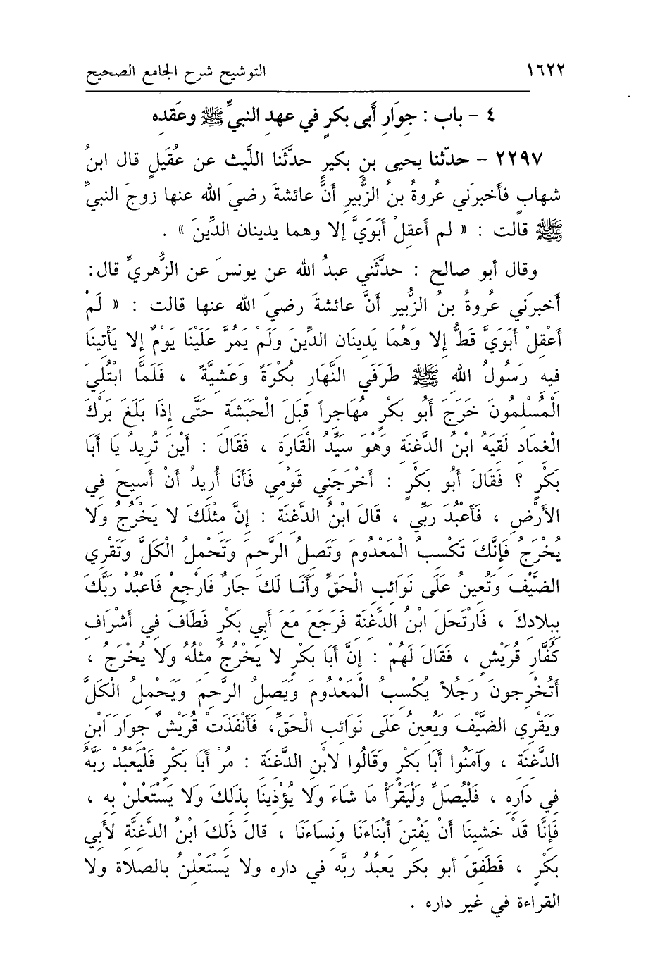 2297 - حَدَّثَنَا يَحْيَى بْنُ بُكَيْرٍ، حَدَّثَنَا اللَّيْثُ، عَنْ عُقَيْلٍ، قَالَ ابْنُ شِهَابٍ: فَأَخْبَرَنِي عُرْوَةُ بْنُ الزُّبَيْرِ، أَنَّ عَائِشَةَ رَضِيَ اللَّهُ عَنْهَا، زَوْجَ النَّبِيِّ صَلَّى اللهُ عَلَيْهِ وَسَلَّمَ، قَالَتْ: لَمْ أَعْقِلْ أَبَوَيَّ قَطُّ إِلَّا وَهُمَا يَدِينَانِ الدِّينَ، وَقَالَ أَبُو صَالِحٍ: حَدَّثَنِي عَبْدُ اللَّهِ، عَنْ يُونُسَ، عَنِ الزُّهْرِيِّ، قَالَ: أَخْبَرَنِي عُرْوَةُ بْنُ الزُّبَيْرِ، أَنَّ عَائِشَةَ رَضِيَ اللَّهُ عَنْهَا، قَالَتْ: لَمْ أَعْقِلْ أَبَوَيَّ قَطُّ إِلَّا وَهُمَا يَدِينَانِ الدِّينَ، وَلَمْ يَمُرَّ عَلَيْنَا يَوْمٌ إِلَّا يَأْتِينَا فِيهِ رَسُولُ اللَّهِ صَلَّى اللهُ عَلَيْهِ وَسَلَّمَ طَرَفَيِ النَّهَارِ، بُكْرَةً وَعَشِيَّةً، فَلَمَّا ابْتُلِيَ المُسْلِمُونَ، خَرَجَ أَبُو بَكْرٍ مُهَاجِرًا قِبَلَ الحَبَشَةِ، حَتَّى إِذَا بَلَغَ بَرْكَ الغِمَادِ لَقِيَهُ ابْنُ الدَّغِنَةِ، وَهُوَ سَيِّدُ القَارَةِ، فَقَالَ: أَيْنَ تُرِيدُ يَا أَبَا بَكْرٍ؟ فَقَالَ أَبُو بَكْرٍ: أَخْرَجَنِي قَوْمِي، فَأَنَا أُرِيدُ أَنْ أَسِيحَ فِي الأَرْضِ، فَأَعْبُدَ رَبِّي، قَالَ ابْنُ الدَّغِنَةِ: إِنَّ مِثْلَكَ لاَ يَخْرُجُ وَلاَ يُخْرَجُ، فَإِنَّكَ تَكْسِبُ المَعْدُومَ، وَتَصِلُ الرَّحِمَ، وَتَحْمِلُ الكَلَّ، وَتَقْرِي الضَّيْفَ، وَتُعِينُ عَلَى نَوَائِبِ الحَقِّ، وَأَنَا لَكَ جَارٌ، فَارْجِعْ فَاعْبُدْ رَبَّكَ بِبِلاَدِكَ، فَارْتَحَلَ ابْنُ الدَّغِنَةِ، فَرَجَعَ مَعَ أَبِي بَكْرٍ، فَطَافَ فِي أَشْرَافِ كُفَّارِ قُرَيْشٍ، فَقَالَ لَهُمْ: إِنَّ أَبَا بَكْرٍ لاَ يَخْرُجُ مِثْلُهُ وَلاَ يُخْرَجُ، أَتُخْرِجُونَ رَجُلًا يُكْسِبُ المَعْدُومَ، وَيَصِلُ الرَّحِمَ، وَيَحْمِلُ الكَلَّ، وَيَقْرِي الضَّيْفَ، وَيُعِينُ عَلَى نَوَائِبِ الحَقِّ، فَأَنْفَذَتْ قُرَيْشٌ جِوَارَ ابْنِ الدَّغِنَةِ، وَآمَنُوا أَبَا بَكْرٍ، وَقَالُوا لِابْنِ الدَّغِنَةِ: مُرْ أَبَا بَكْرٍ، فَلْيَعْبُدْ رَبَّهُ فِي دَارِهِ، فَلْيُصَلِّ، وَلْيَقْرَأْ مَا شَاءَ، وَلاَ يُؤْذِينَا بِذَلِكَ، وَلاَ يَسْتَعْلِنْ بِهِ، فَإِنَّا قَدْ خَشِينَا أَنْ يَفْتِنَ أَبْنَاءَنَا وَنِسَاءَنَا، قَالَ ذَلِكَ ابْنُ الدَّغِنَةِ لِأَبِي بَكْرٍ، فَطَفِقَ أَبُو بَكْرٍ يَعْبُدُ رَبَّهُ فِي دَارِهِ، وَلاَ يَسْتَعْلِنُ بِالصَّلاَةِ، وَلاَ القِرَاءَةِ فِي غَيْرِ دَارِهِ.