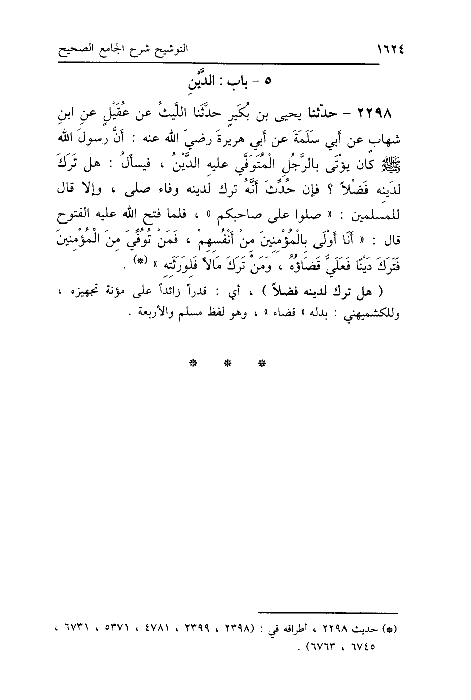 2298 - حَدَّثَنَا يَحْيَى بْنُ بُكَيْرٍ، حَدَّثَنَا اللَّيْثُ، عَنْ عُقَيْلٍ، عَنِ ابْنِ شِهَابٍ، عَنْ أَبِي سَلَمَةَ، عَنْ أَبِي هُرَيْرَةَ رَضِيَ اللَّهُ عَنْهُ: أَنَّ رَسُولَ اللَّهِ صَلَّى اللهُ عَلَيْهِ وَسَلَّمَ كَانَ يُؤْتَى بِالرَّجُلِ المُتَوَفَّى، عَلَيْهِ الدَّيْنُ، فَيَسْأَلُ: «هَلْ تَرَكَ لِدَيْنِهِ فَضْلًا؟»، فَإِنْ حُدِّثَ أَنَّهُ تَرَكَ لِدَيْنِهِ وَفَاءً صَلَّى، وَإِلَّا قَالَ لِلْمُسْلِمِينَ: «صَلُّوا عَلَى صَاحِبِكُمْ»، فَلَمَّا فَتَحَ اللَّهُ عَلَيْهِ الفُتُوحَ، قَالَ: «أَنَا أَوْلَى بِالْمُؤْمِنِينَ مِنْ أَنْفُسِهِمْ، فَمَنْ تُوُفِّيَ مِنَ المُؤْمِنِينَ فَتَرَكَ دَيْنًا، فَعَلَيَّ قَضَاؤُهُ، وَمَنْ تَرَكَ مَالًا فَلِوَرَثَتِهِ».