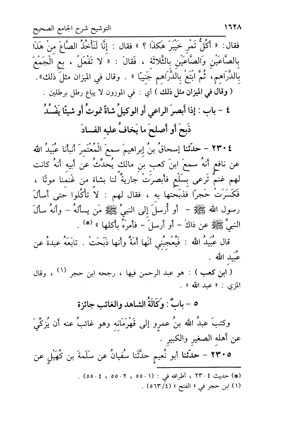 2304 - حَدَّثَنَا إِسْحَاقُ بْنُ إِبْرَاهِيمَ، سَمِعَ المُعْتَمِرَ، أَنْبَأَنَا عُبَيْدُ اللَّهِ، عَنْ نَافِعٍ، أَنَّهُ سَمِعَ ابْنَ كَعْبِ بْنِ مَالِكٍ، يُحَدِّثُ عَنْ أَبِيهِ، أَنَّهُ كَانَتْ لَهُمْ غَنَمٌ تَرْعَى بِسَلْعٍ، فَأَبْصَرَتْ جَارِيَةٌ لَنَا بِشَاةٍ مِنْ غَنَمِنَا مَوْتًا، فَكَسَرَتْ حَجَرًا فَذَبَحَتْهَا بِهِ، فَقَالَ لَهُمْ: لاَ تَأْكُلُوا حَتَّى أَسْأَلَ النَّبِيَّ صَلَّى اللهُ عَلَيْهِ وَسَلَّمَ، أَوْ أُرْسِلَ إِلَى النَّبِيِّ صَلَّى اللهُ عَلَيْهِ وَسَلَّمَ مَنْ يَسْأَلُهُ، وَأَنَّهُ سَأَلَ النَّبِيَّ صَلَّى اللهُ عَلَيْهِ وَسَلَّمَ عَنْ ذَاكَ، أَوْ أَرْسَلَ، «فَأَمَرَهُ بِأَكْلِهَا» قَالَ عُبَيْدُ اللَّهِ: «فَيُعْجِبُنِي أَنَّهَا أَمَةٌ، وَأَنَّهَا ذَبَحَتْ» تَابَعَهُ عَبْدَةُ عَنْ عُبَيْدِ اللَّهِ.