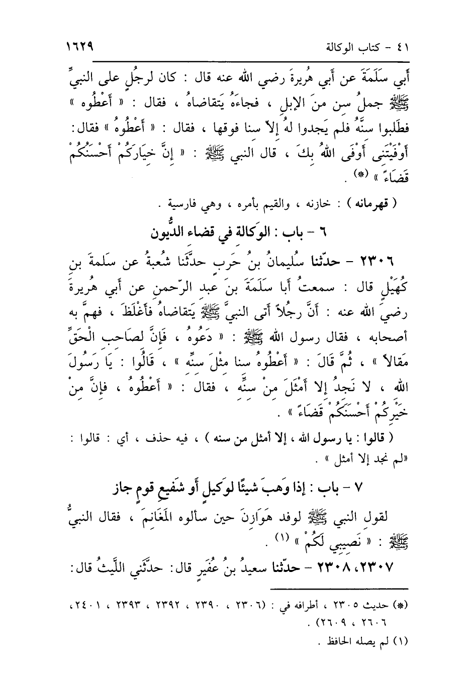 2306 - حَدَّثَنَا سُلَيْمَانُ بْنُ حَرْبٍ، حَدَّثَنَا شُعْبَةُ، عَنْ سَلَمَةَ بْنِ كُهَيْلٍ، سَمِعْتُ أَبَا سَلَمَةَ بْنَ عَبْدِ الرَّحْمَنِ، عَنْ أَبِي هُرَيْرَةَ رَضِيَ اللَّهُ عَنْهُ: أَنَّ رَجُلًا أَتَى النَّبِيَّ صَلَّى اللهُ عَلَيْهِ وَسَلَّمَ يَتَقَاضَاهُ، فَأَغْلَظَ فَهَمَّ بِهِ أَصْحَابُهُ، فَقَالَ رَسُولُ اللَّهِ صَلَّى اللهُ عَلَيْهِ وَسَلَّمَ: «دَعُوهُ، فَإِنَّ لِصَاحِبِ الحَقِّ مَقَالًا»، ثُمَّ قَالَ: «أَعْطُوهُ سِنًّا مِثْلَ سِنِّهِ»، قَالُوا: يَا رَسُولَ اللَّهِ، إِلَّا أَمْثَلَ مِنْ سِنِّهِ، فَقَالَ: «أَعْطُوهُ، فَإِنَّ مِنْ خَيْرِكُمْ أَحْسَنَكُمْ قَضَاءً».