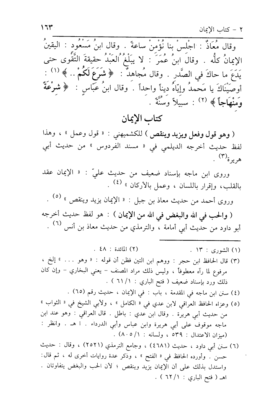 وَقَالَ مُعَاذُ بْنُ جَبَلٍ: «اجْلِسْ بِنَا نُؤْمِنْ سَاعَةً» وَقَالَ ابْنُ مَسْعُودٍ: «اليَقِينُ الإِيمَانُ كُلُّهُ» وَقَالَ ابْنُ عُمَرَ: «لاَ يَبْلُغُ العَبْدُ حَقِيقَةَ التَّقْوَى حَتَّى يَدَعَ مَا حَاكَ فِي الصَّدْرِ» وَقَالَ مُجَاهِدٌ: «شَرَعَ لَكُمْ مِنَ الدِّينِ أَوْصَيْنَاكَ يَا مُحَمَّدُ وَإِيَّاهُ دِينًا وَاحِدًا» وَقَالَ ابْنُ عَبَّاسٍ: «شِرْعَةً وَمِنْهَاجًا» سَبِيلًا وَسُنَّةً.