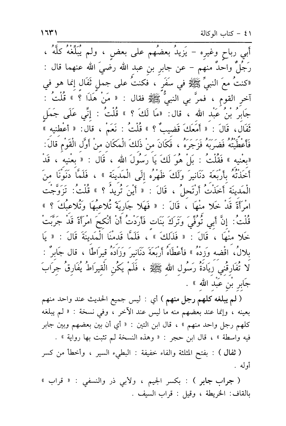 أَبِي رَبَاحٍ، وَغَيْرِهِ، يَزِيدُ بَعْضُهُمْ عَلَى بَعْضٍ، وَلَمْ يُبَلِّغْهُ كُلُّهُمْ رَجُلٌ وَاحِدٌ مِنْهُمْ، عَنْ جَابِرِ بْنِ عَبْدِ اللَّهِ رَضِيَ اللَّهُ عَنْهُمَا، قَالَ: كُنْتُ مَعَ النَّبِيِّ صَلَّى اللهُ عَلَيْهِ وَسَلَّمَ فِي سَفَرٍ، فَكُنْتُ عَلَى جَمَلٍ ثَفَالٍ إِنَّمَا هُوَ فِي آخِرِ القَوْمِ، فَمَرَّ بِي النَّبِيُّ صَلَّى اللهُ عَلَيْهِ وَسَلَّمَ، فَقَالَ: «مَنْ هَذَا؟»، قُلْتُ جَابِرُ بْنُ عَبْدِ اللَّهِ، قَالَ: «مَا لَكَ؟»، قُلْتُ: إِنِّي عَلَى جَمَلٍ ثَفَالٍ، قَالَ: «أَمَعَكَ قَضِيبٌ؟» قُلْتُ: نَعَمْ، قَالَ: «أَعْطِنِيهِ»، فَأَعْطَيْتُهُ، فَضَرَبَهُ، فَزَجَرَهُ، فَكَانَ مِنْ ذَلِكَ المَكَانِ مِنْ أَوَّلِ القَوْمِ، قَالَ: «بِعْنِيهِ»، فَقُلْتُ: بَلْ، هُوَ لَكَ يَا رَسُولَ اللَّهِ، قَالَ: «بَلْ بِعْنِيهِ قَدْ أَخَذْتُهُ بِأَرْبَعَةِ دَنَانِيرَ، وَلَكَ ظَهْرُهُ إِلَى المَدِينَةِ»، فَلَمَّا دَنَوْنَا مِنَ المَدِينَةِ أَخَذْتُ أَرْتَحِلُ، قَالَ: «أَيْنَ تُرِيدُ؟»، قُلْتُ: تَزَوَّجْتُ امْرَأَةً قَدْ خَلاَ مِنْهَا، قَالَ: «فَهَلَّا جَارِيَةً تُلاَعِبُهَا وَتُلاَعِبُكَ»، قُلْتُ: إِنَّ أَبِي تُوُفِّيَ، وَتَرَكَ بَنَاتٍ، فَأَرَدْتُ أَنْ أَنْكِحَ امْرَأَةً قَدْ جَرَّبَتْ خَلاَ مِنْهَا، قَالَ: «فَذَلِكَ»، فَلَمَّا قَدِمْنَا المَدِينَةَ، قَالَ: «يَا بِلاَلُ، اقْضِهِ وَزِدْهُ»، فَأَعْطَاهُ أَرْبَعَةَ دَنَانِيرَ، وَزَادَهُ قِيرَاطًا، قَالَ جَابِرٌ: لاَ تُفَارِقُنِي زِيَادَةُ رَسُولِ اللَّهِ صَلَّى اللهُ عَلَيْهِ وَسَلَّمَ، فَلَمْ يَكُنِ القِيرَاطُ يُفَارِقُ جِرَابَ جَابِرِ بْنِ عَبْدِ اللَّهِ.